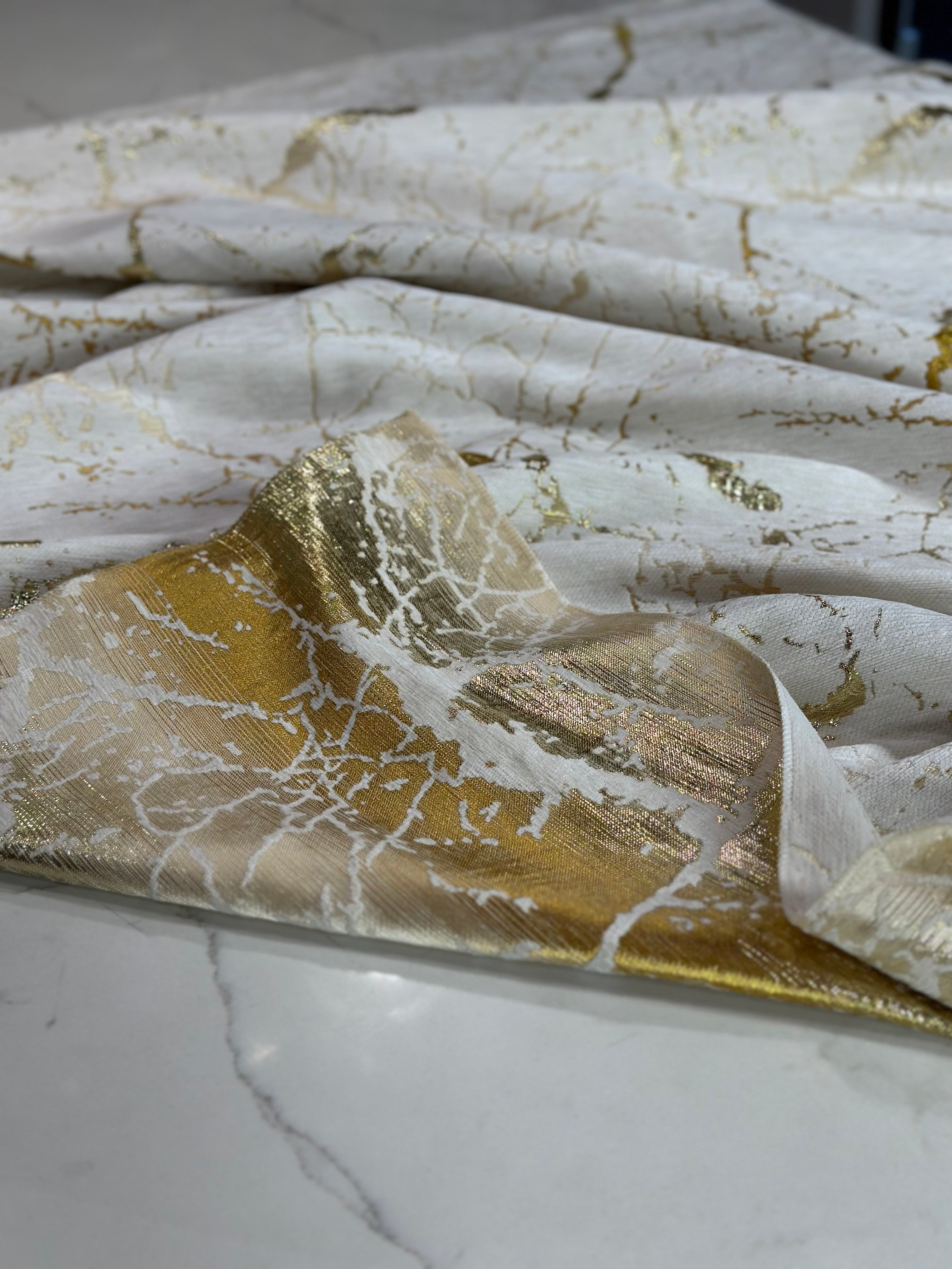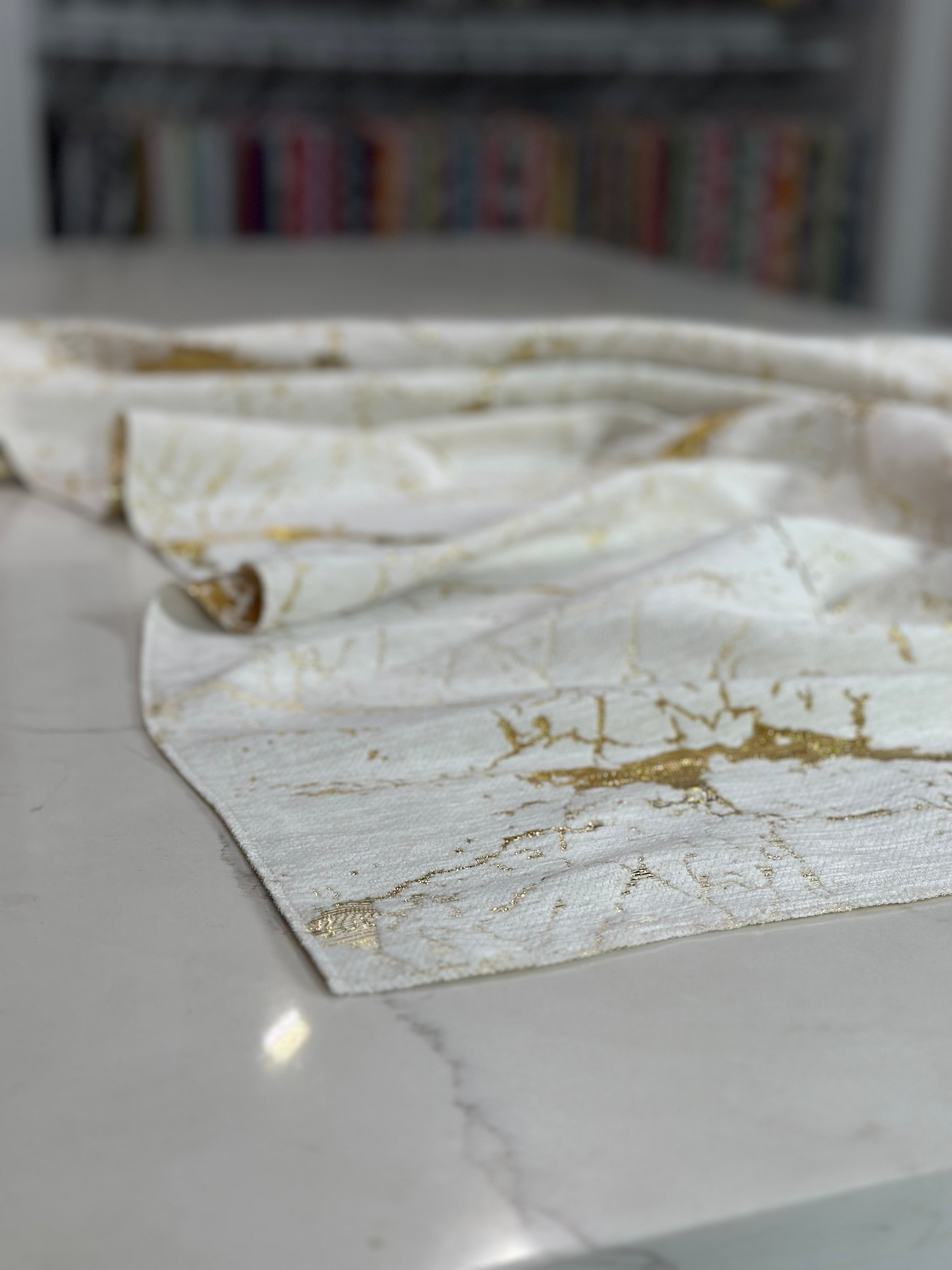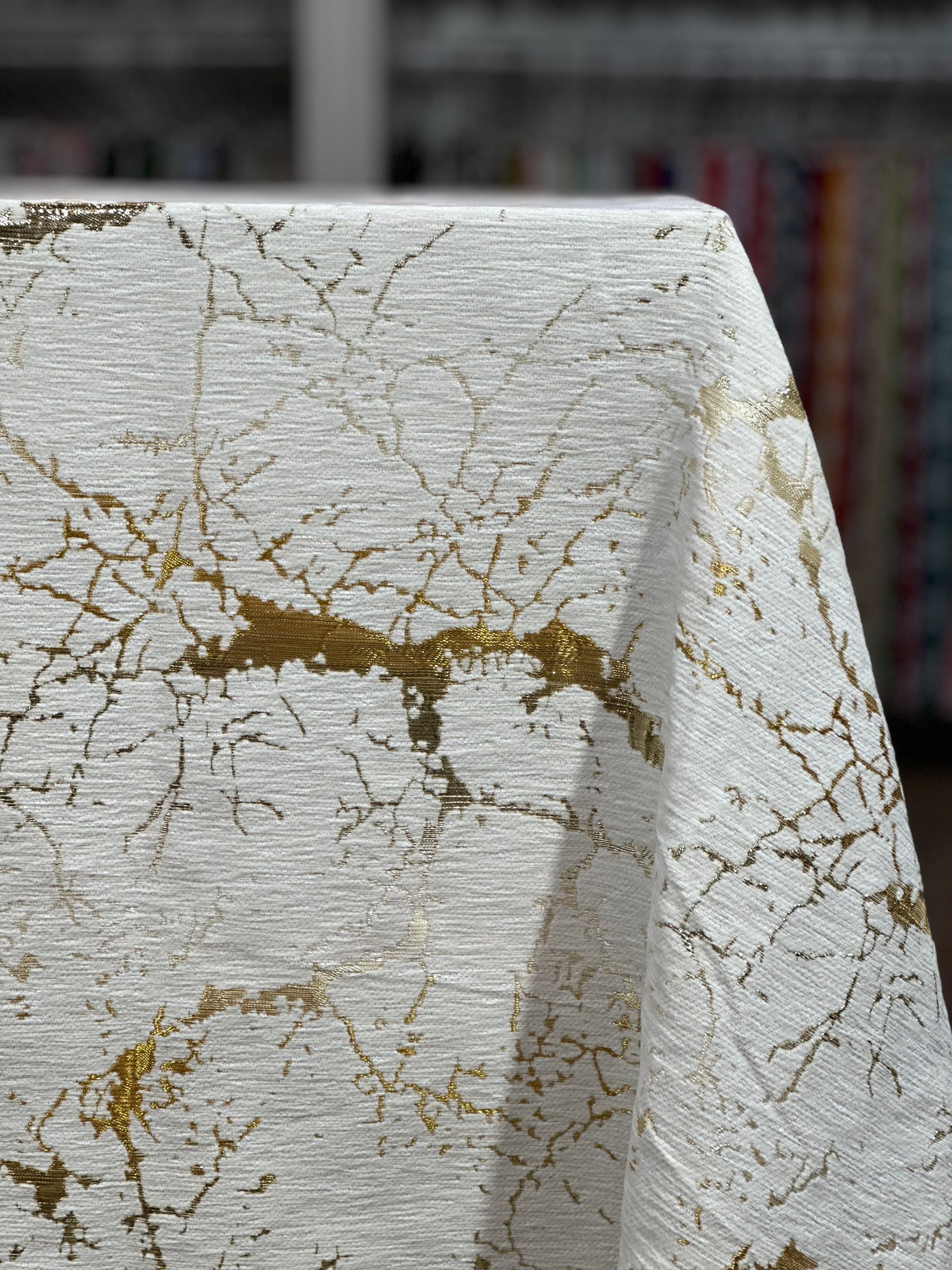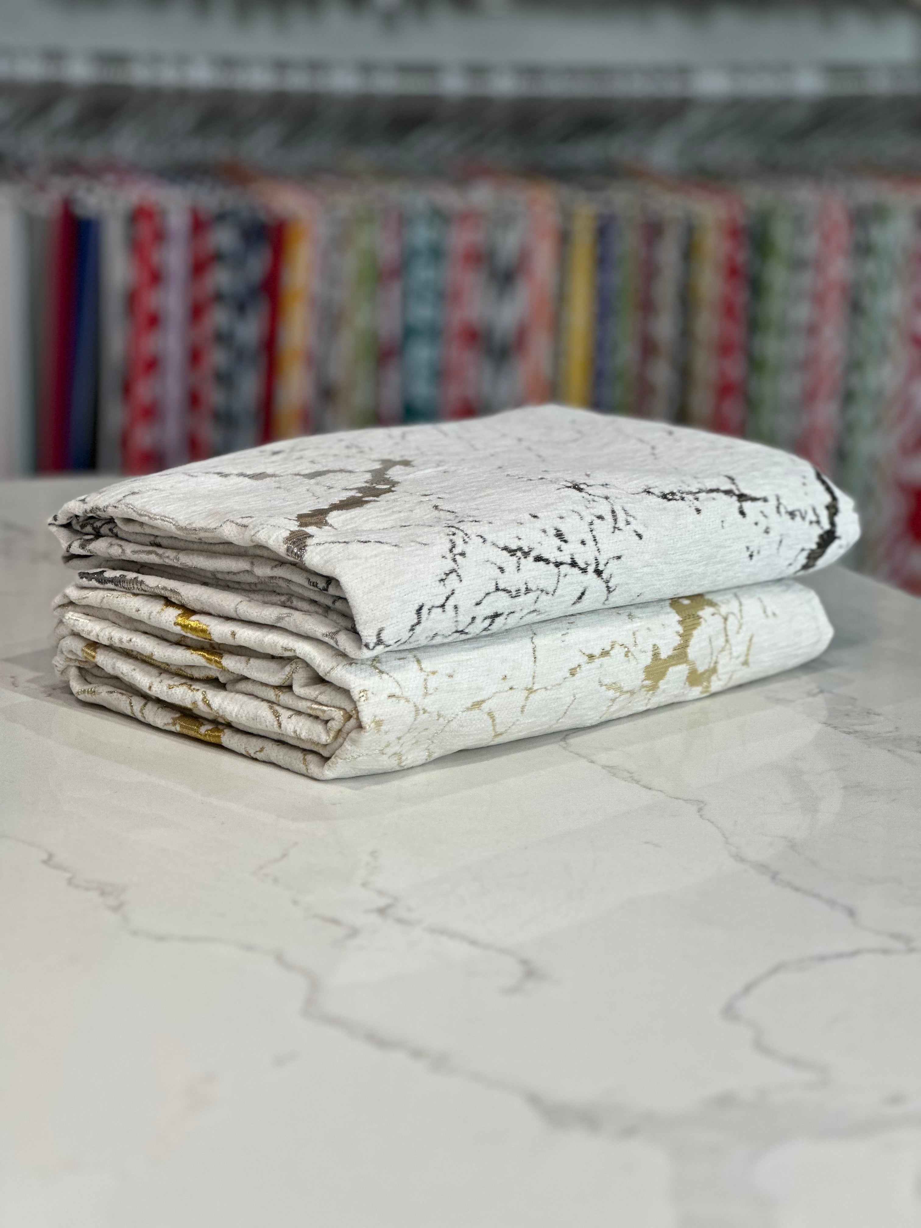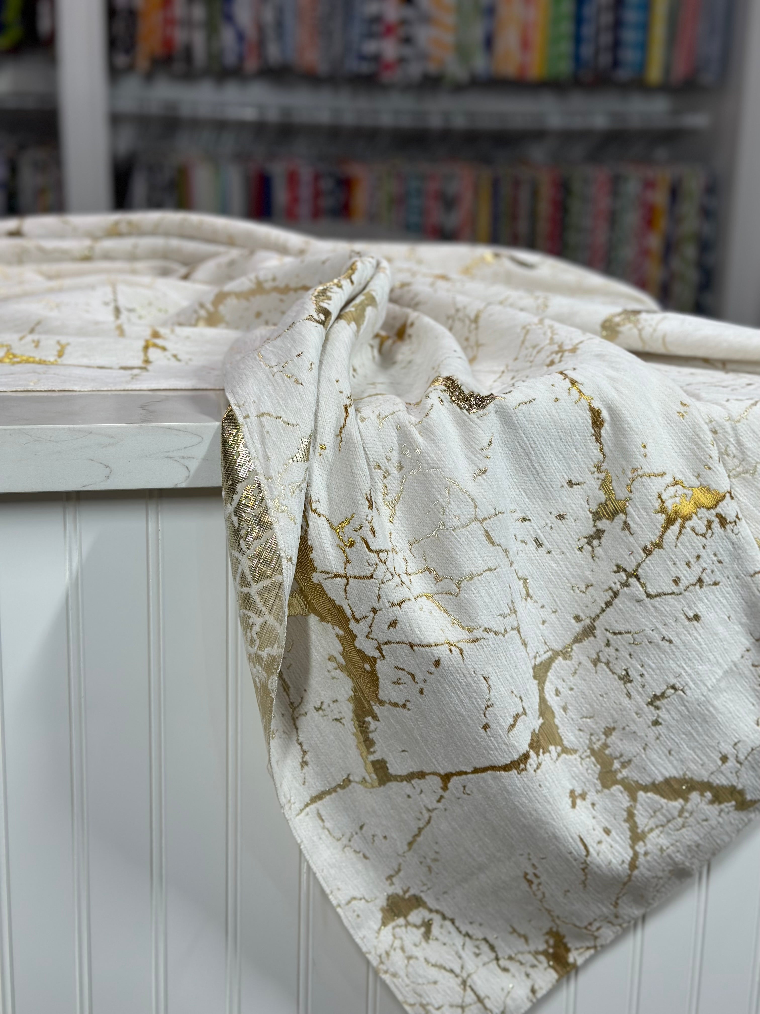 Fabric Collection: This fabric is a Jacquard Embroidery in our "Marble" Design that has a metallic threading throughout and a soft plush finish to the material.