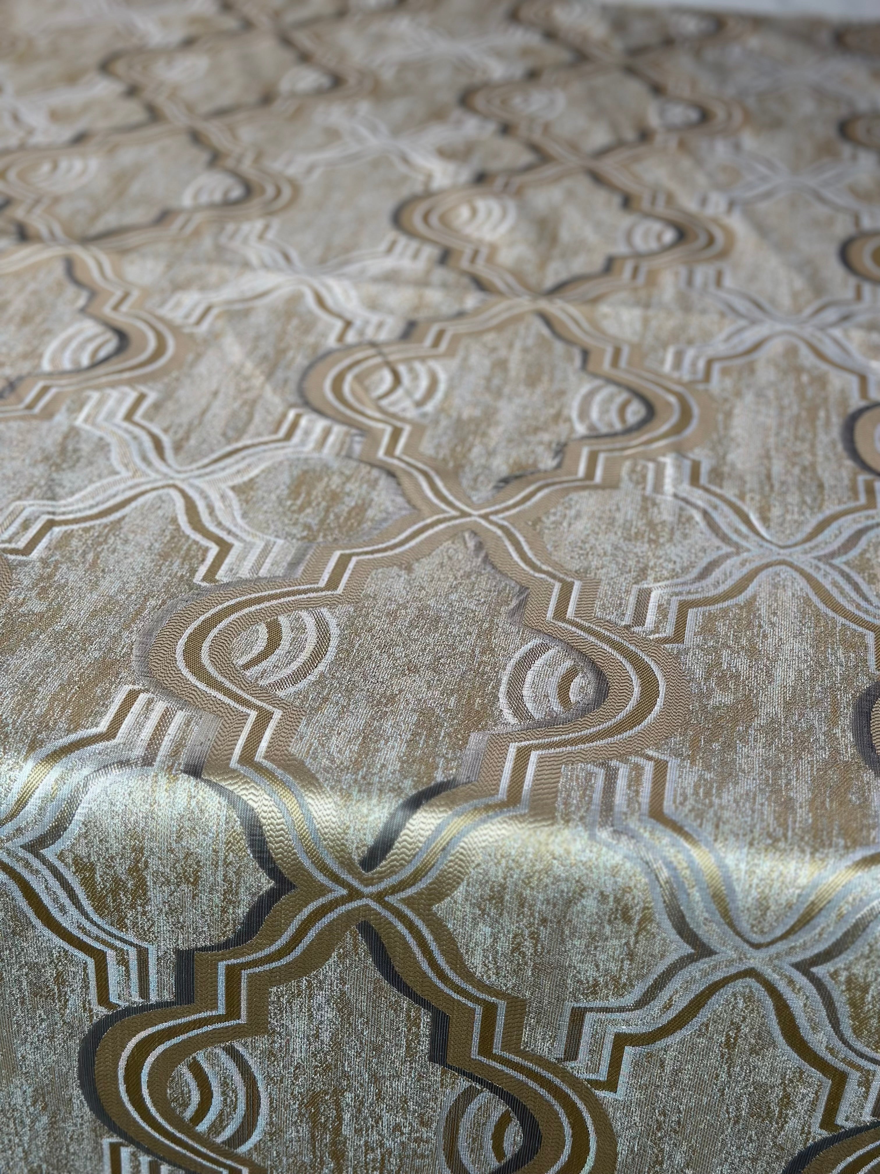 Fabric Collection: 100% Polyester base with metallic embroidered design and multi tone color throughout.