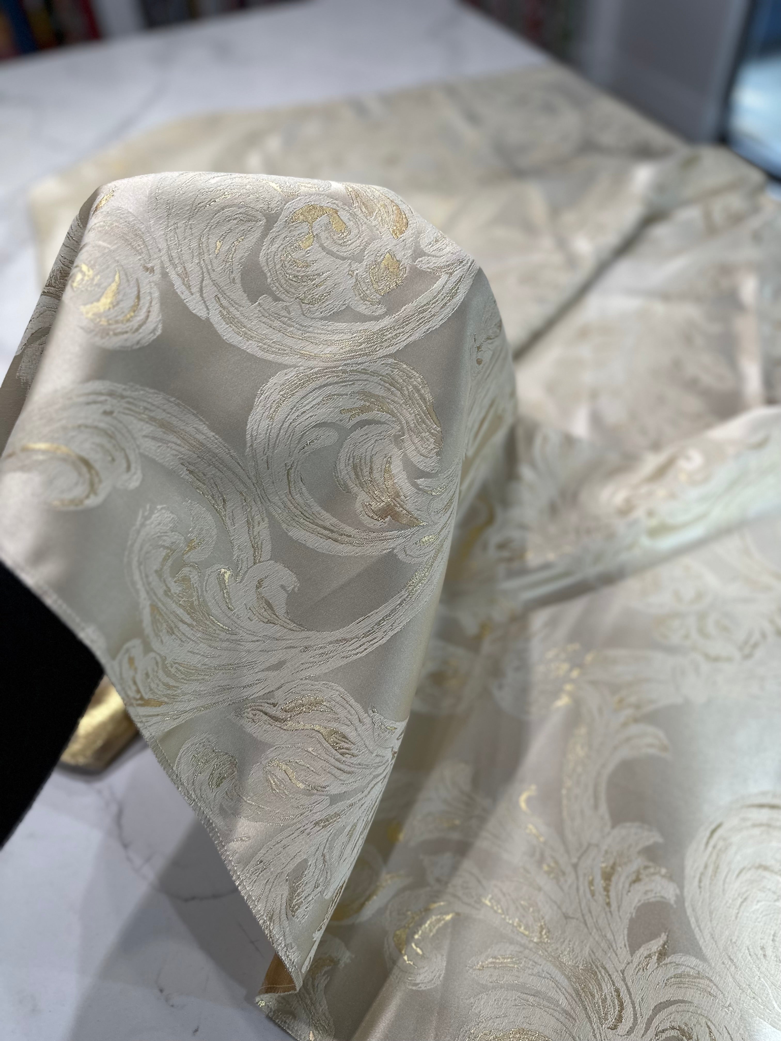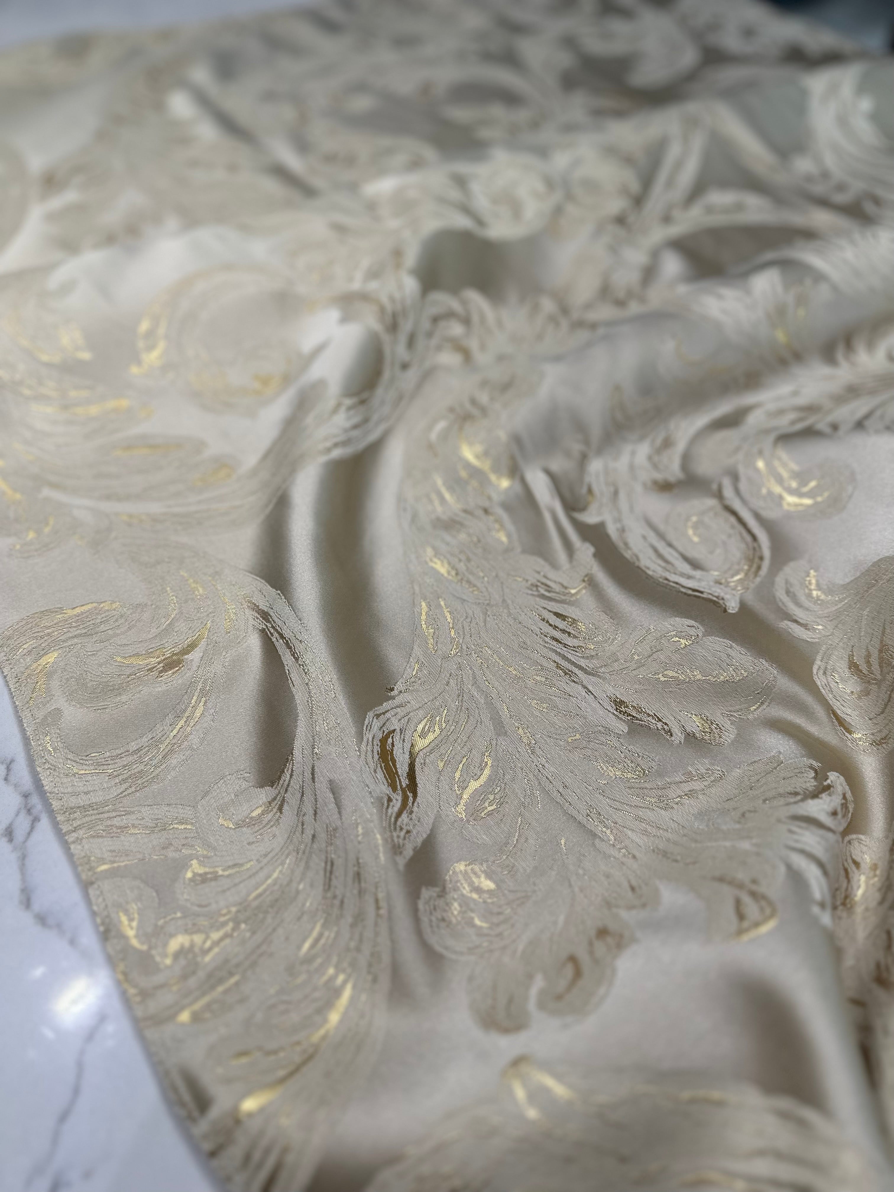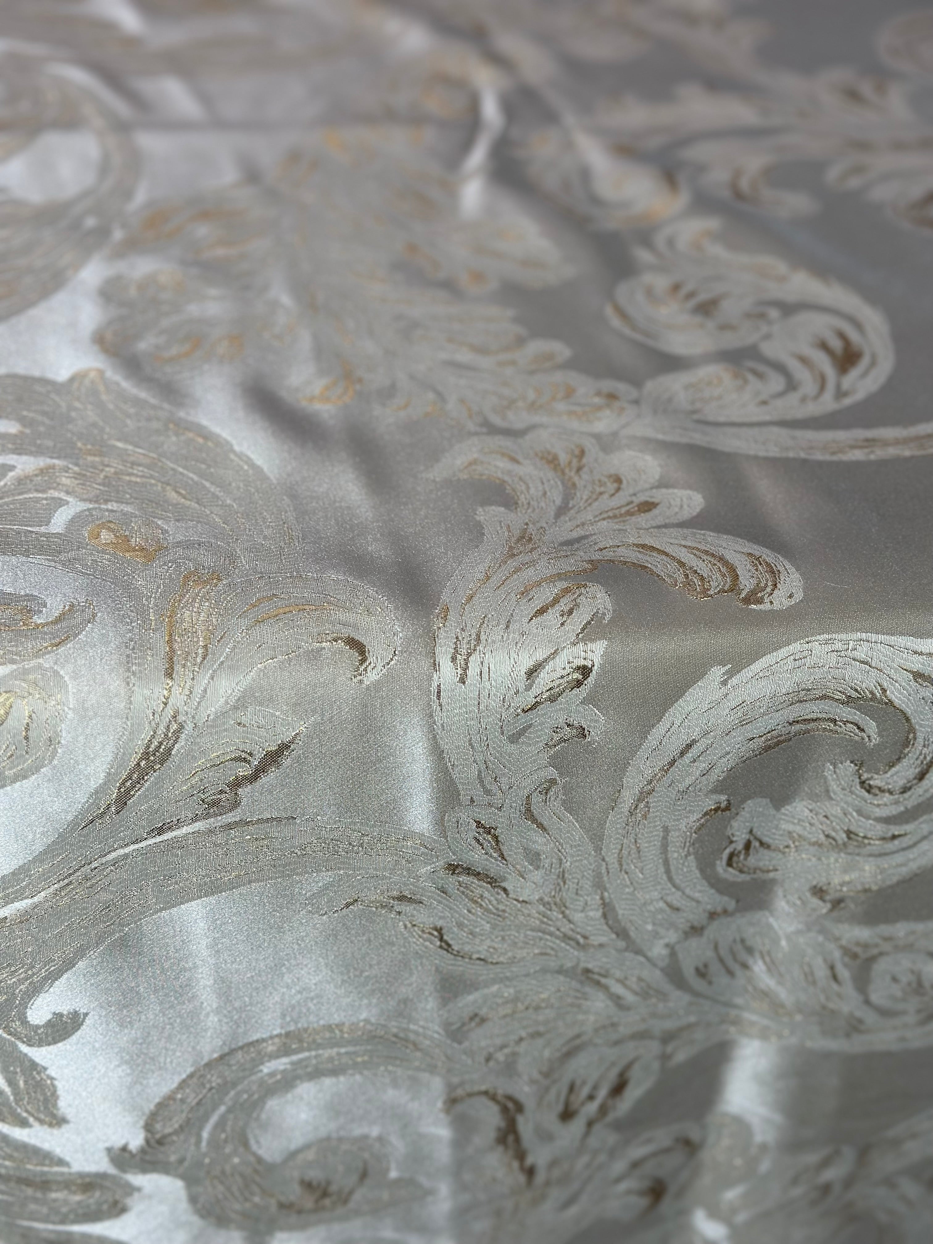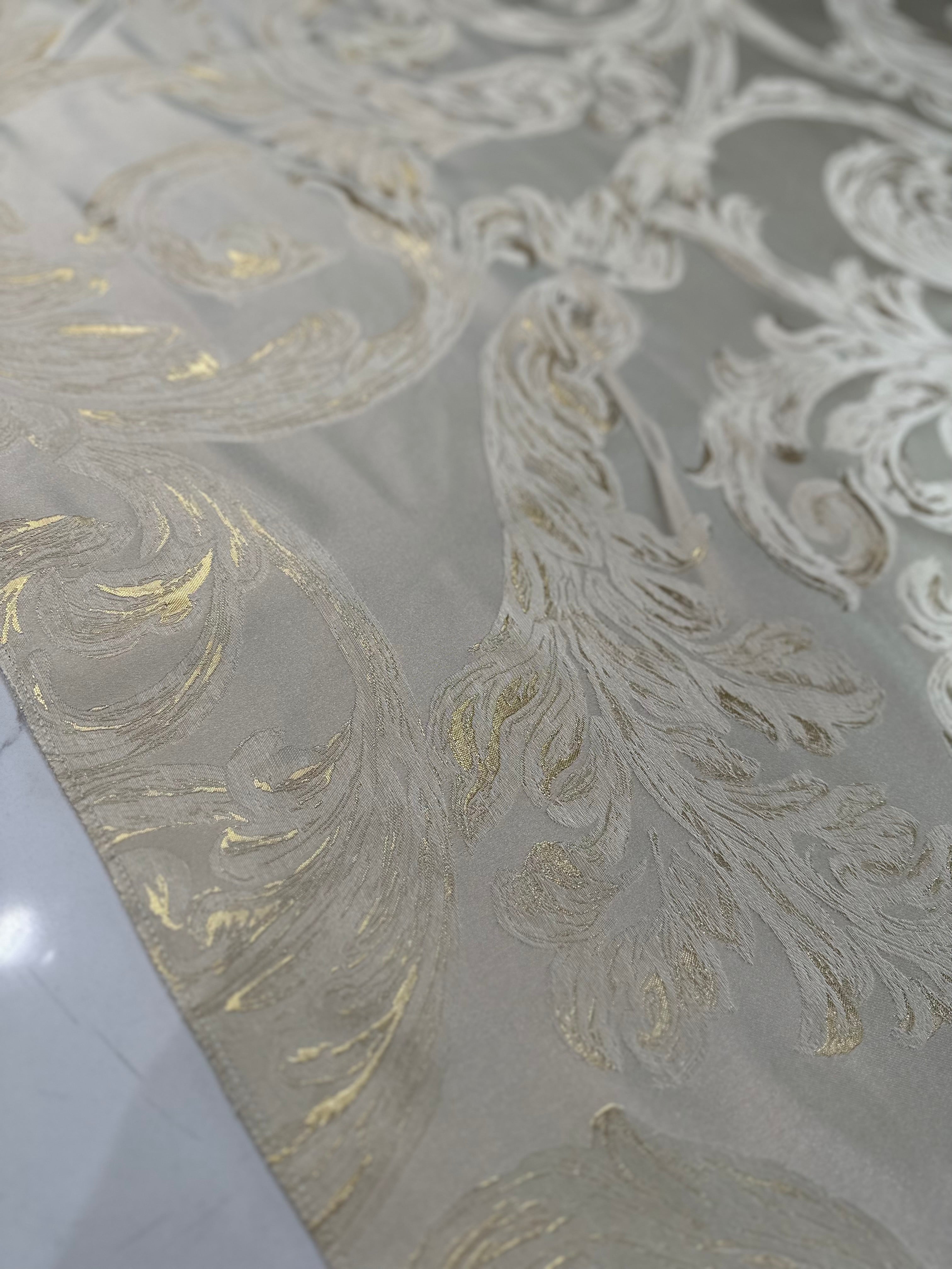Fabric Collection: This fabric has a polyester base with metallic embroidered design in our "Florence" pattern and has a multi tone color throughout.