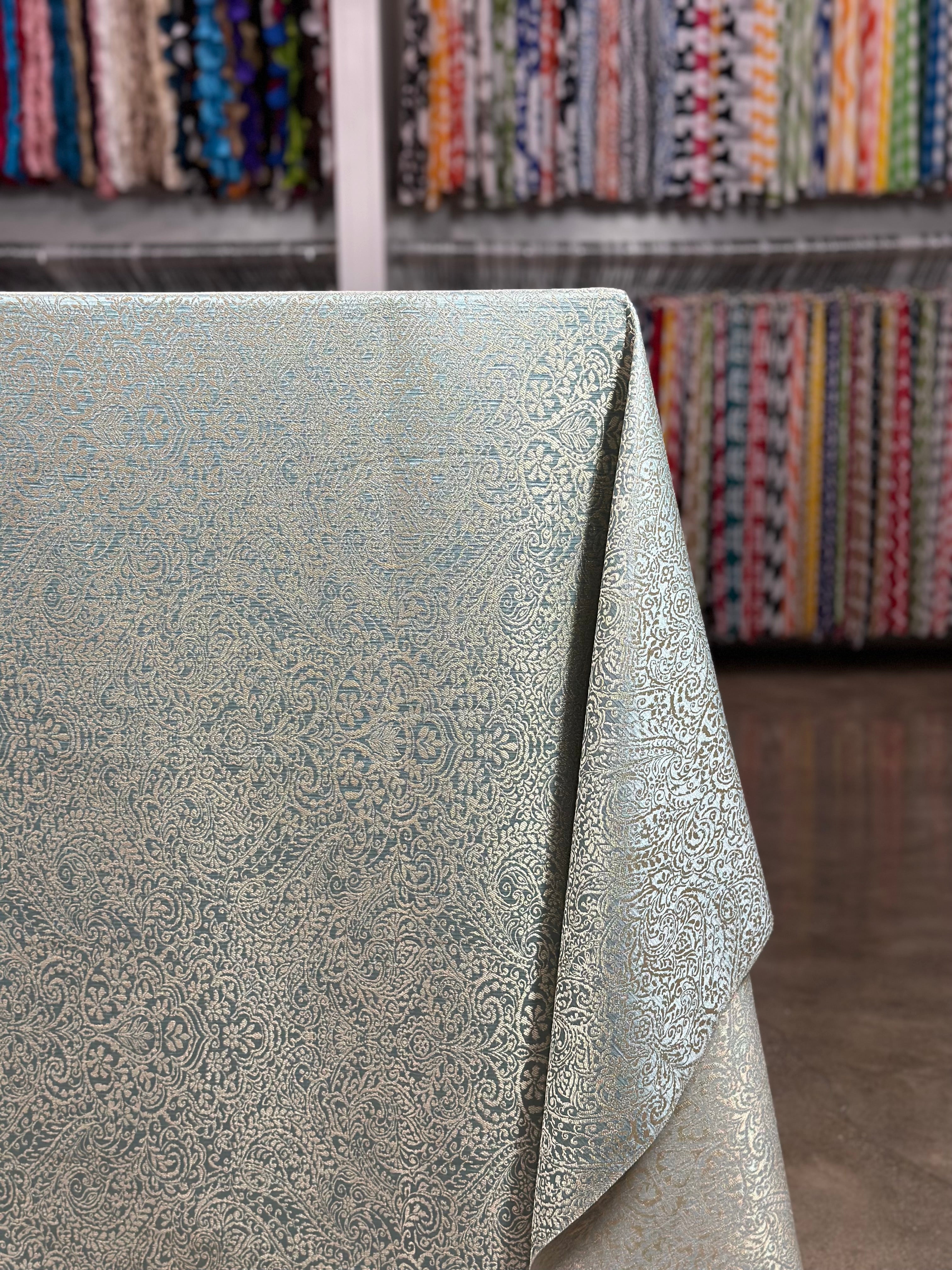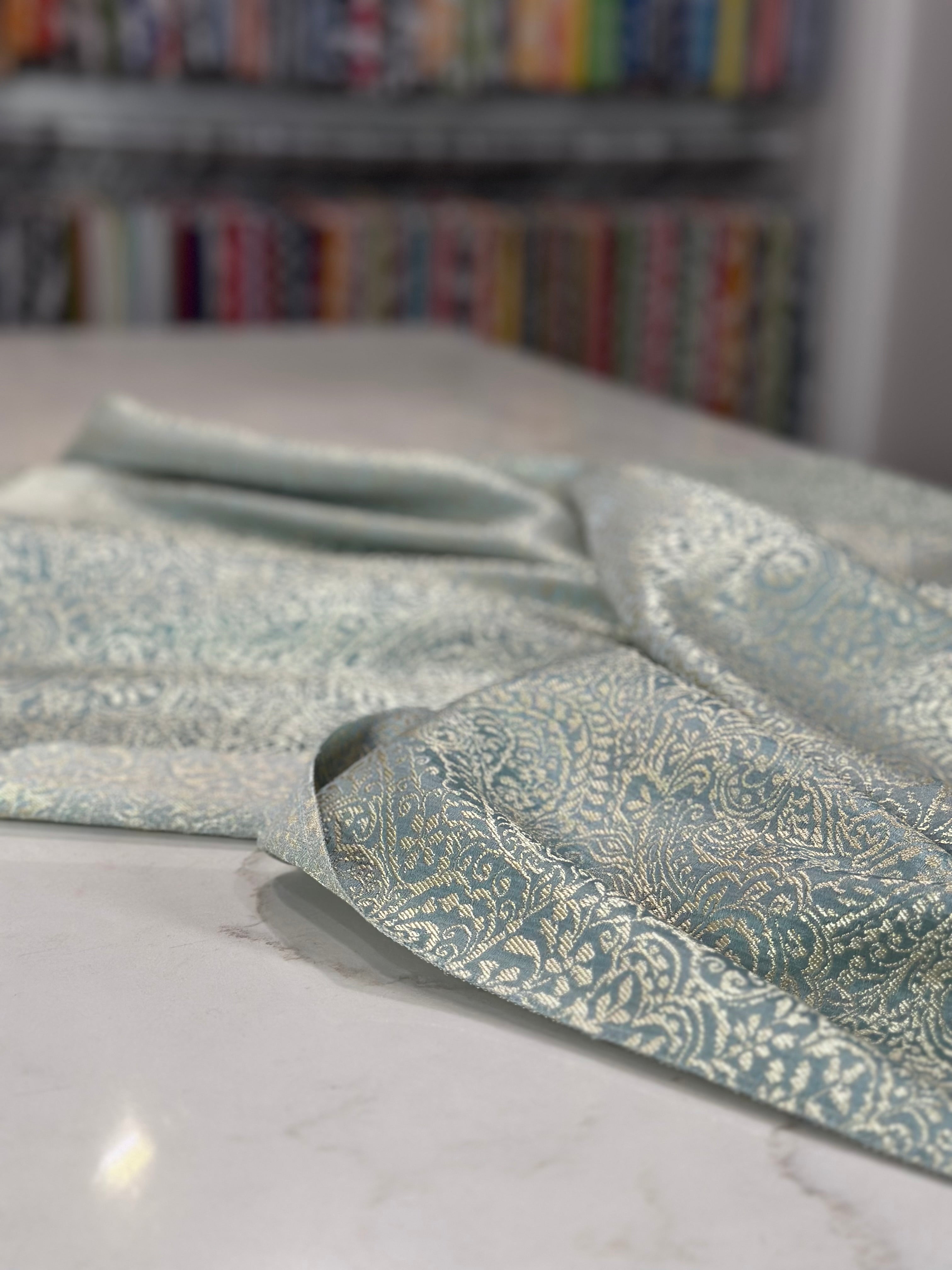 Fabric Collection: This fabric is a Polyester base with metallic embroidered design and multi tone color throughout material.
