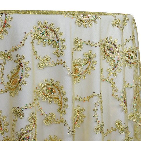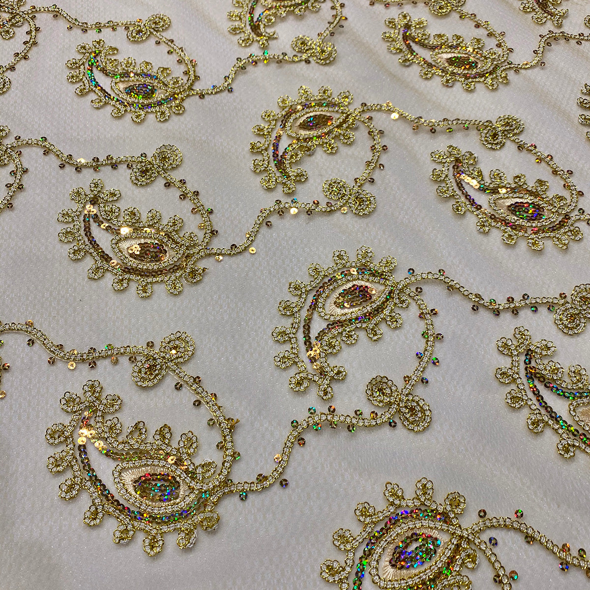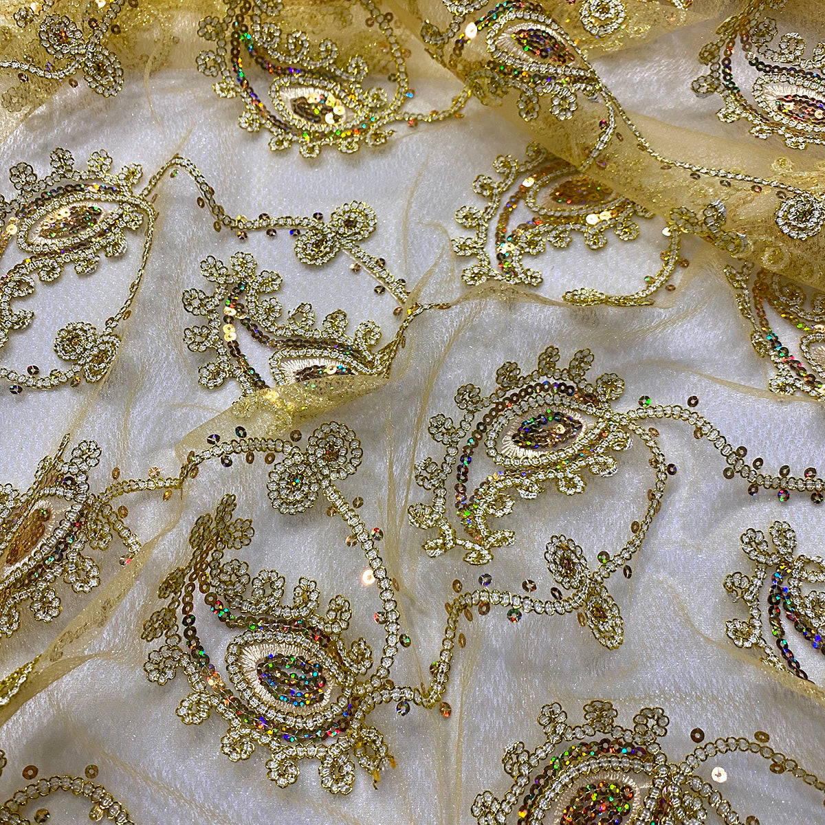 Fabric Collection: This fabric has a mesh netting base w/ a Paisley design embroidery with sequins throughout.