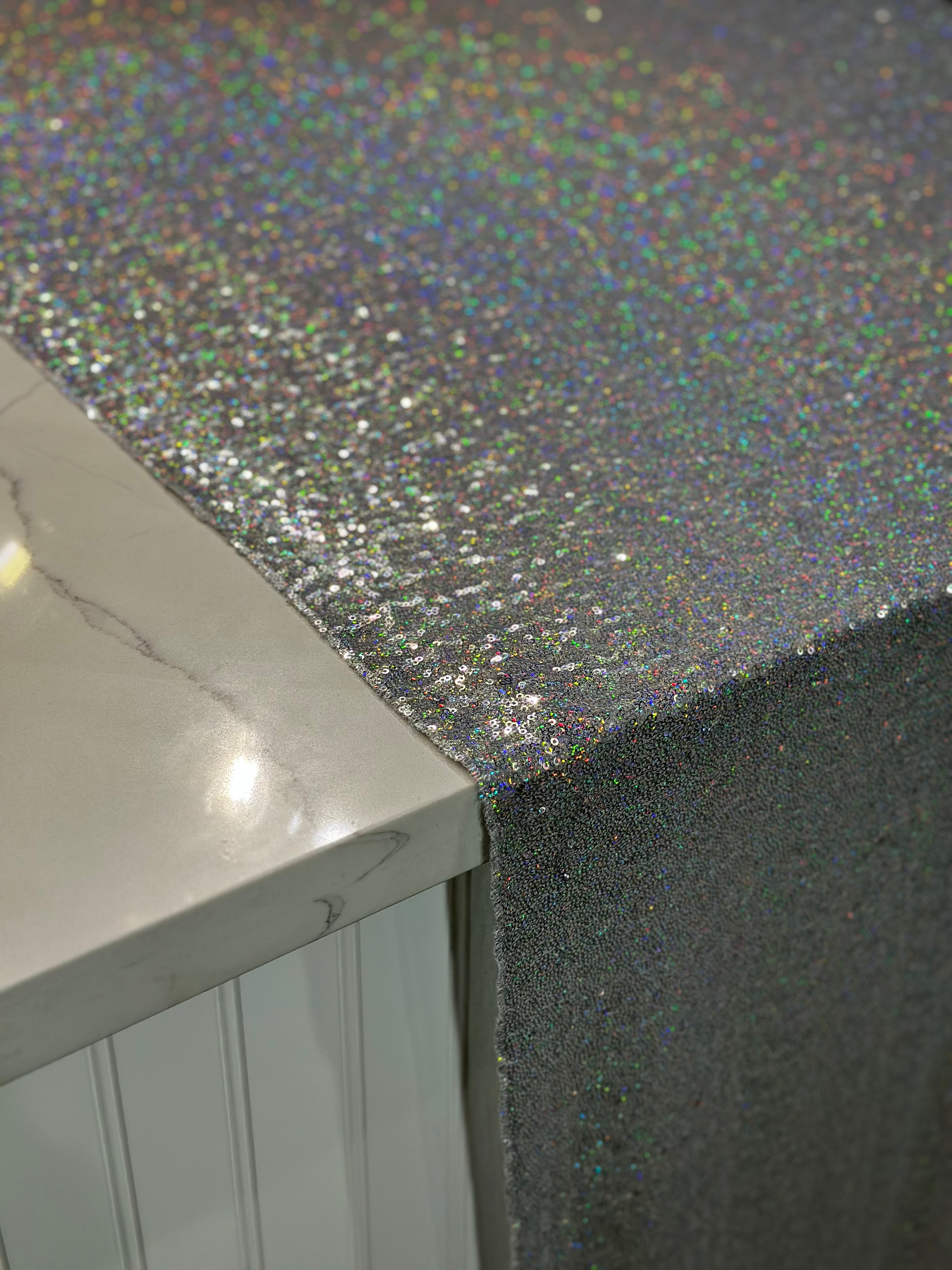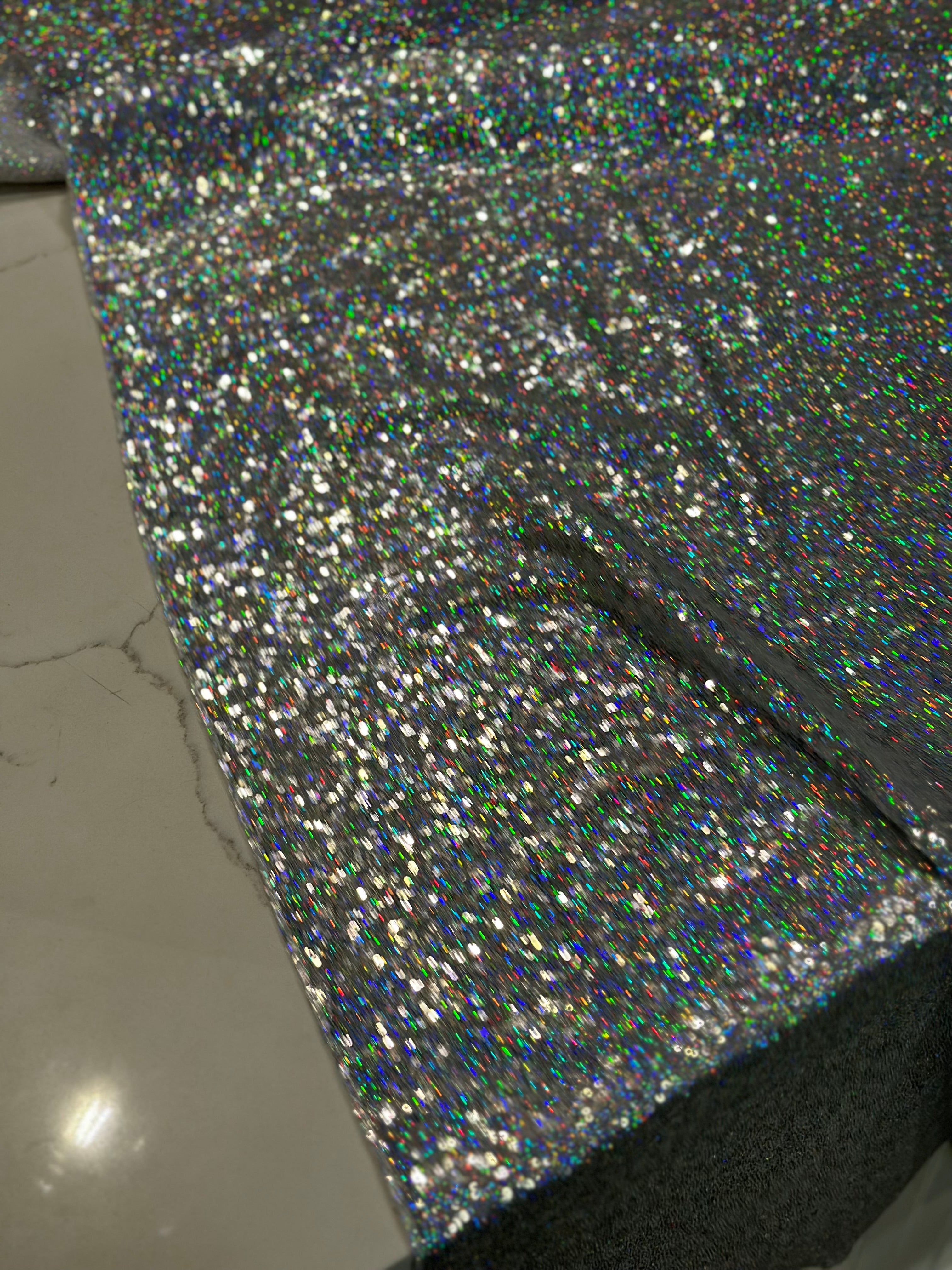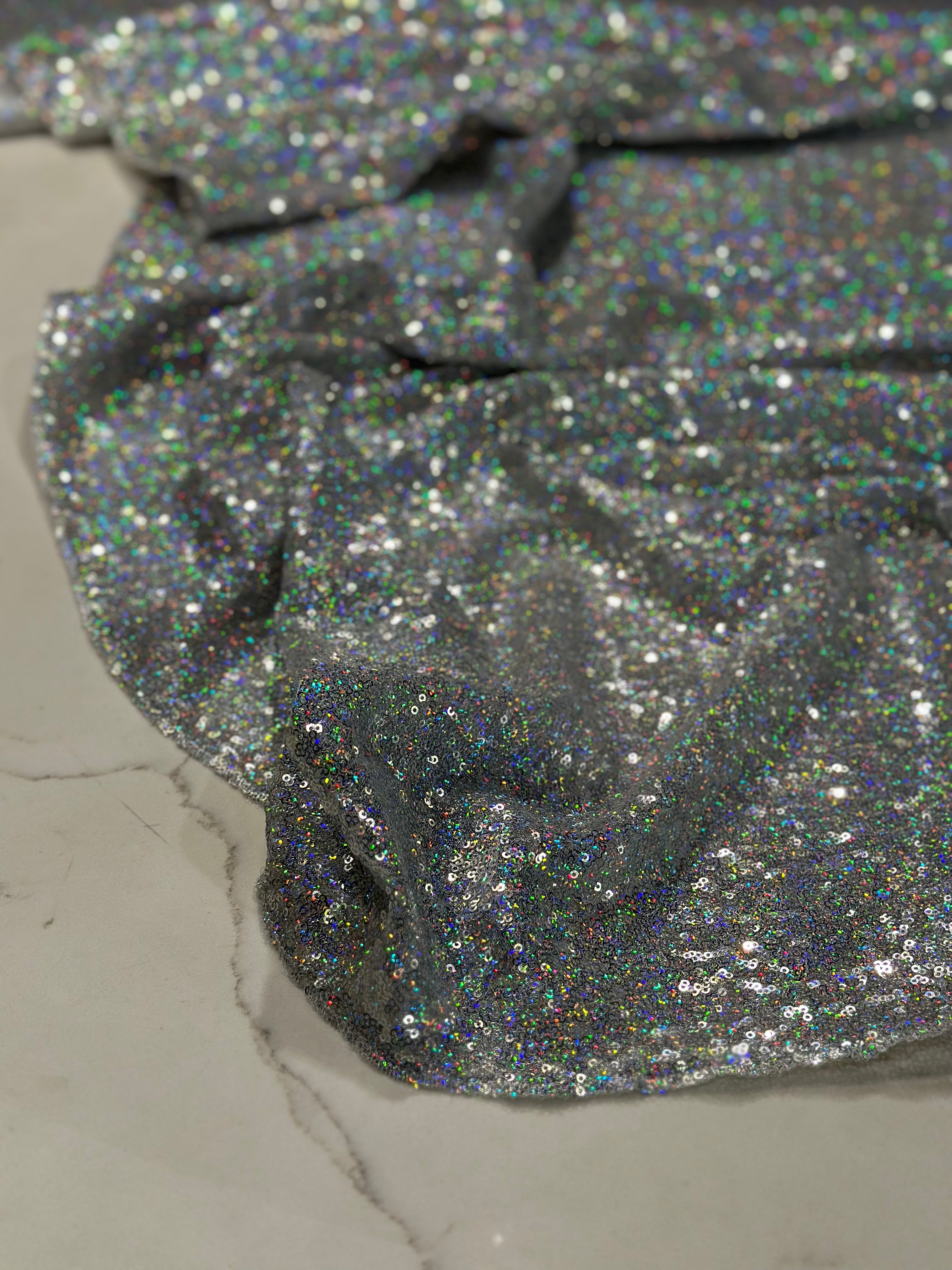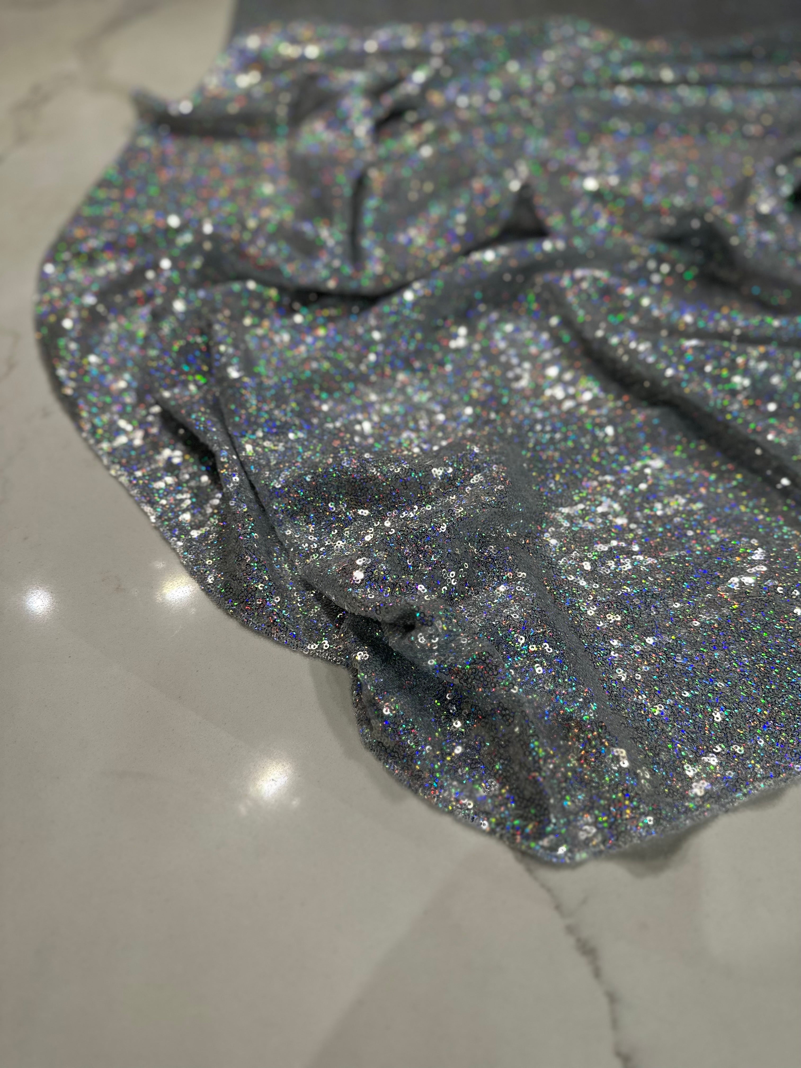 Fabric Collection: This fabric has a mesh base w/ mini sequins clusters embroidered throughout the fabric which gives it a solid look.