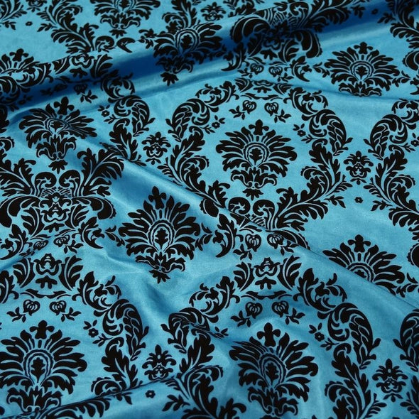 Damask Flocking Taffeta Table Runner in Black on Turquoise