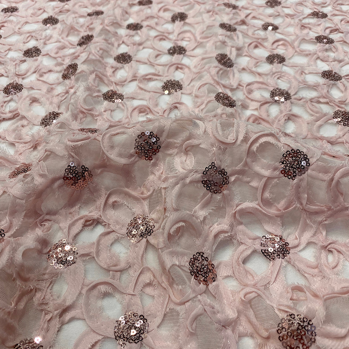 Fabric Collection: This fabric has a mesh/sheer base w/ a flower petal embroidery design w/ sequins.