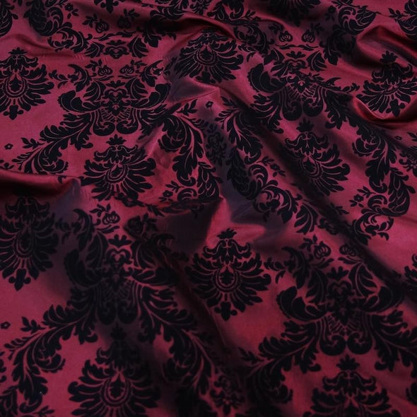 Damask Flocking Taffeta Table Linen in Black on Burgundy