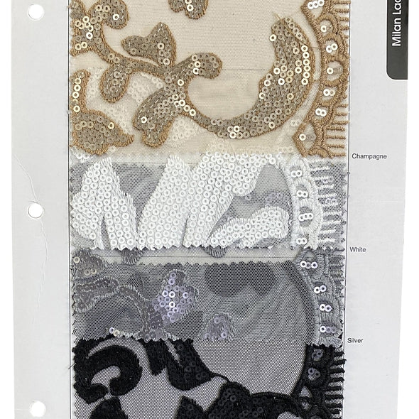 Fabric Collection: This material has a mesh/sheer base w/ sequins embroidery in our "Milan" design throughout the fabric.