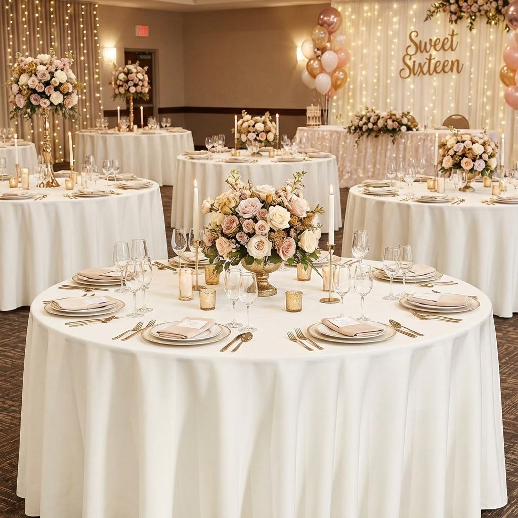 The most popular Scuba (Wrinkle Free) tablecloth sizes cater to both round and banquet-style tables, offering tailored options for every setup. For round tables, the 90” Round is ideal for smaller tables, providing a stylish drape. The 108” Round works perfectly for medium tables, offering a generous drop, while the 120” Round suits larger tables, delivering an elegant, full-length look. The 132” Round is perfect for the largest tables, creating a dramatic, floor-length finish. For banquet tables, the sizes include 60” x 102”, which is designed for smaller banquet tables and offers a tailored appearance, and the 60” x 120” for medium-length tables, delivering a polished look. For longer tables, the 90” x 132” provides a seamless finish, while the 90” x 156” ensures a refined and sophisticated touch for extra-long tables. These versatile sizes make it easy to find the perfect fit for your event.