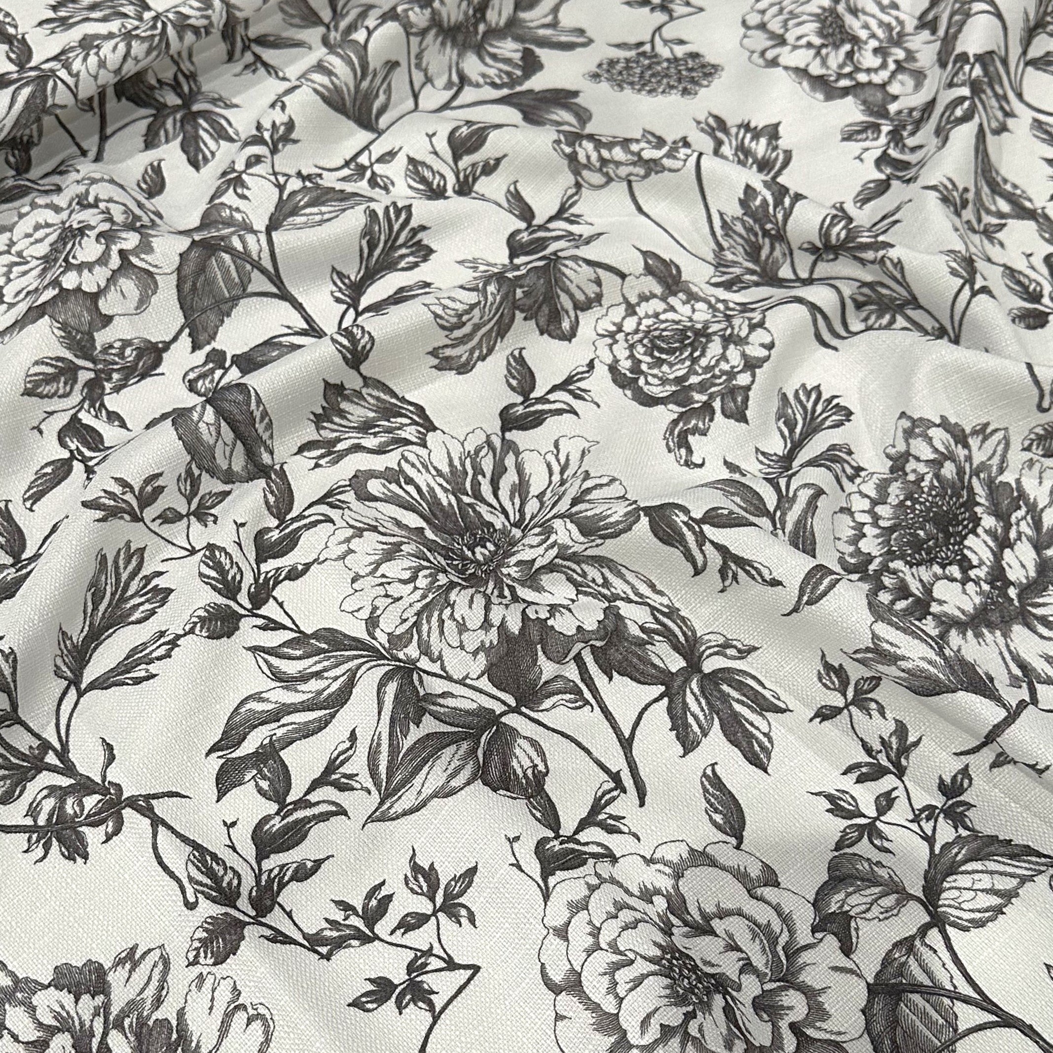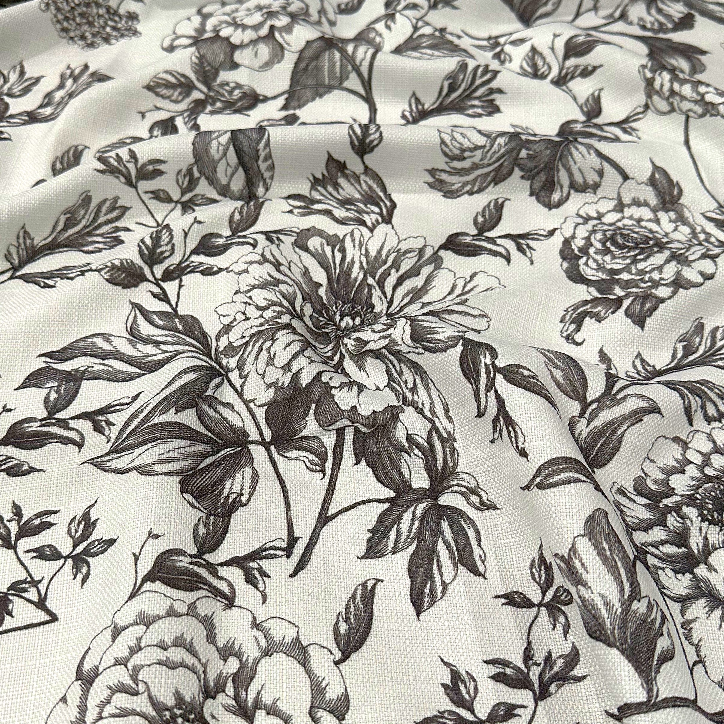 Fabric Collection: Our Artistry Bloom fabric offers a gorgeous toile de jouy vintage floral pattern on a white base. This stunning design is printed on a polyester fabric which also has a rustic slub-like textured finish.