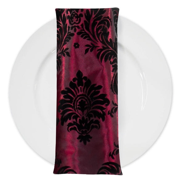 Damask Flocking Taffeta Table Napkin in Black on Burgundy