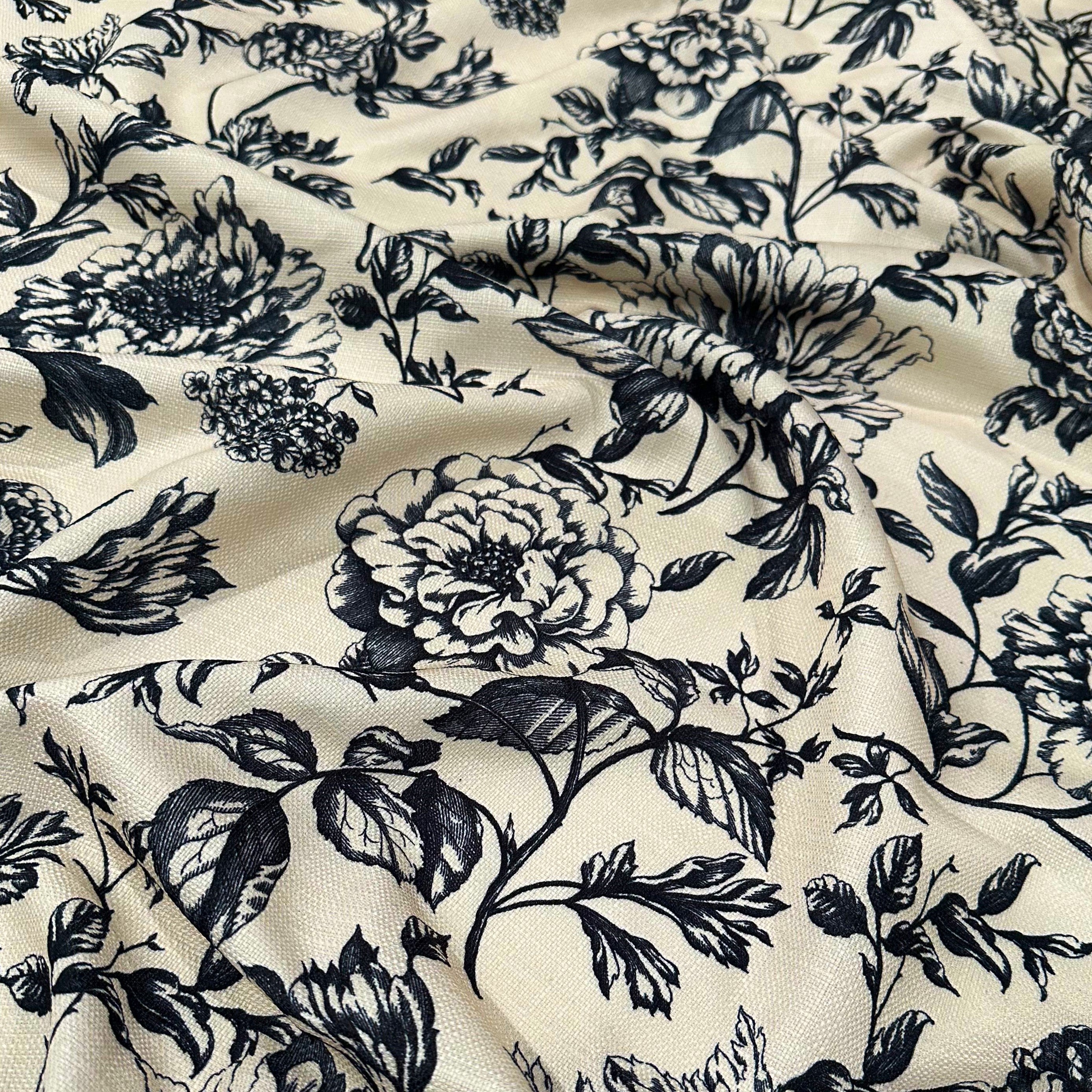 Fabric Collection: Our Artistry Bloom fabric offers a gorgeous toile de jouy vintage floral pattern on a white base. This stunning design is printed on a polyester fabric which also has a rustic slub-like textured finish.
