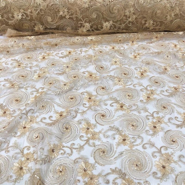 Fabric Collection: This material has a mesh/sheer base w/ sequins embroidery throughout the fabric in a swirl and floral design.