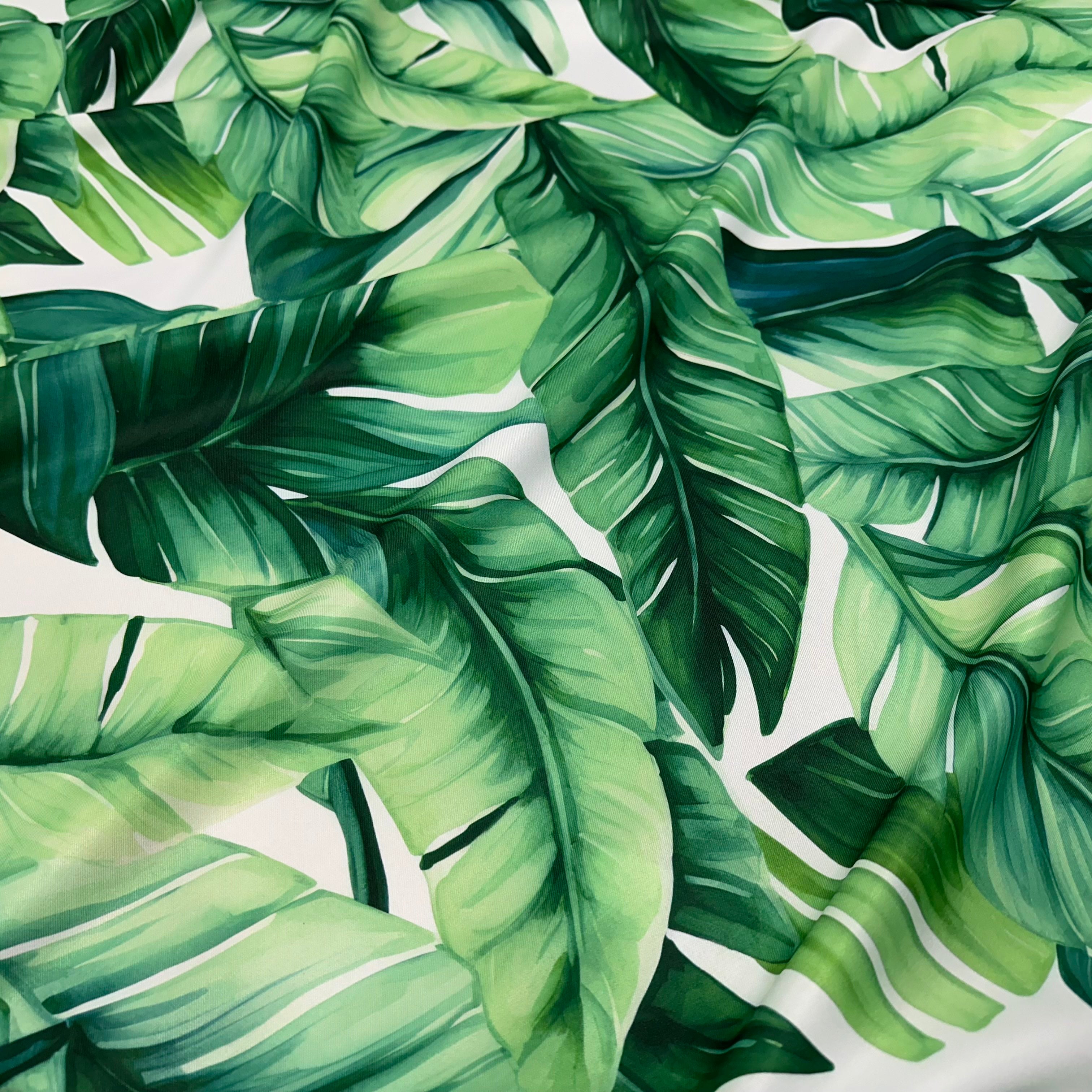 Fabric Collection: This fabric is 100% polyester base with our "Melrose" palm leaves throughout the fabric with a white background.