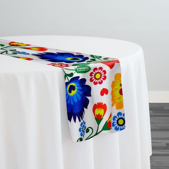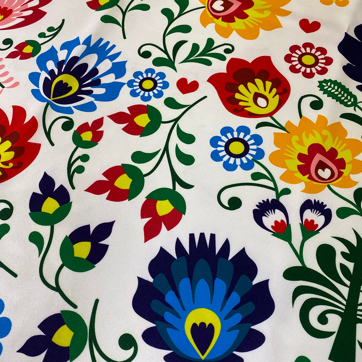 Fabric Collection: This fabric is a polyester base with our colorful "Flower Hoop" print throughout