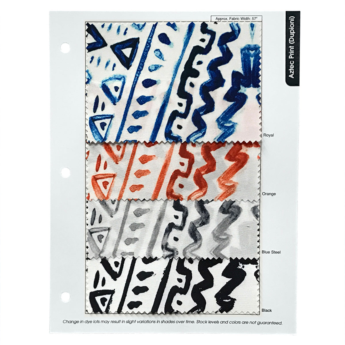 Fabric Collection: This fabric is 100% polyester base with a Dupioni finish and an Aztec print throughout.