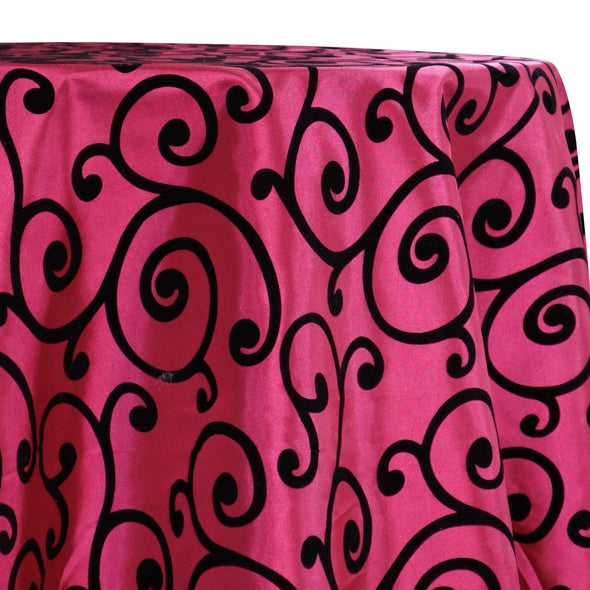Swirl Flocking Taffeta Table Linen in Black on Fuchsia