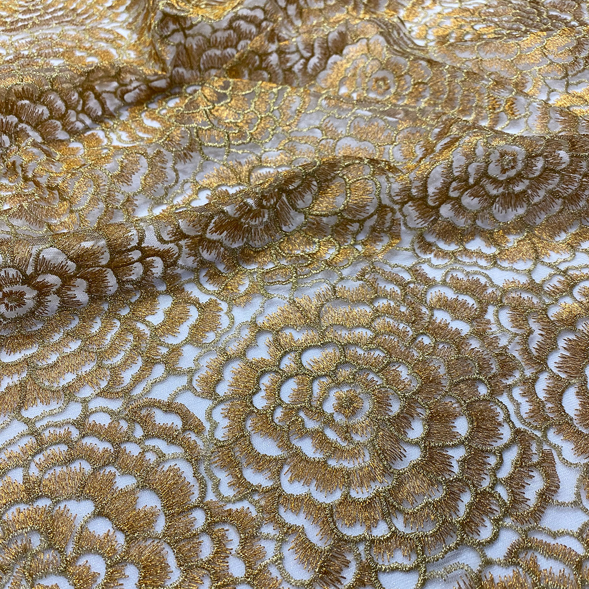Fabric Collection: This fabric has a mesh/sheer base w/ a floral & metallic design embroidered throughout.