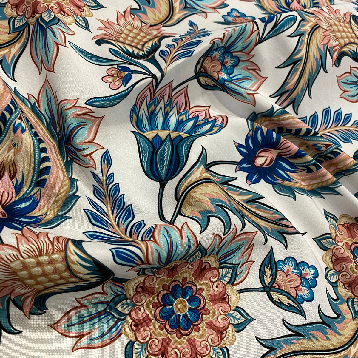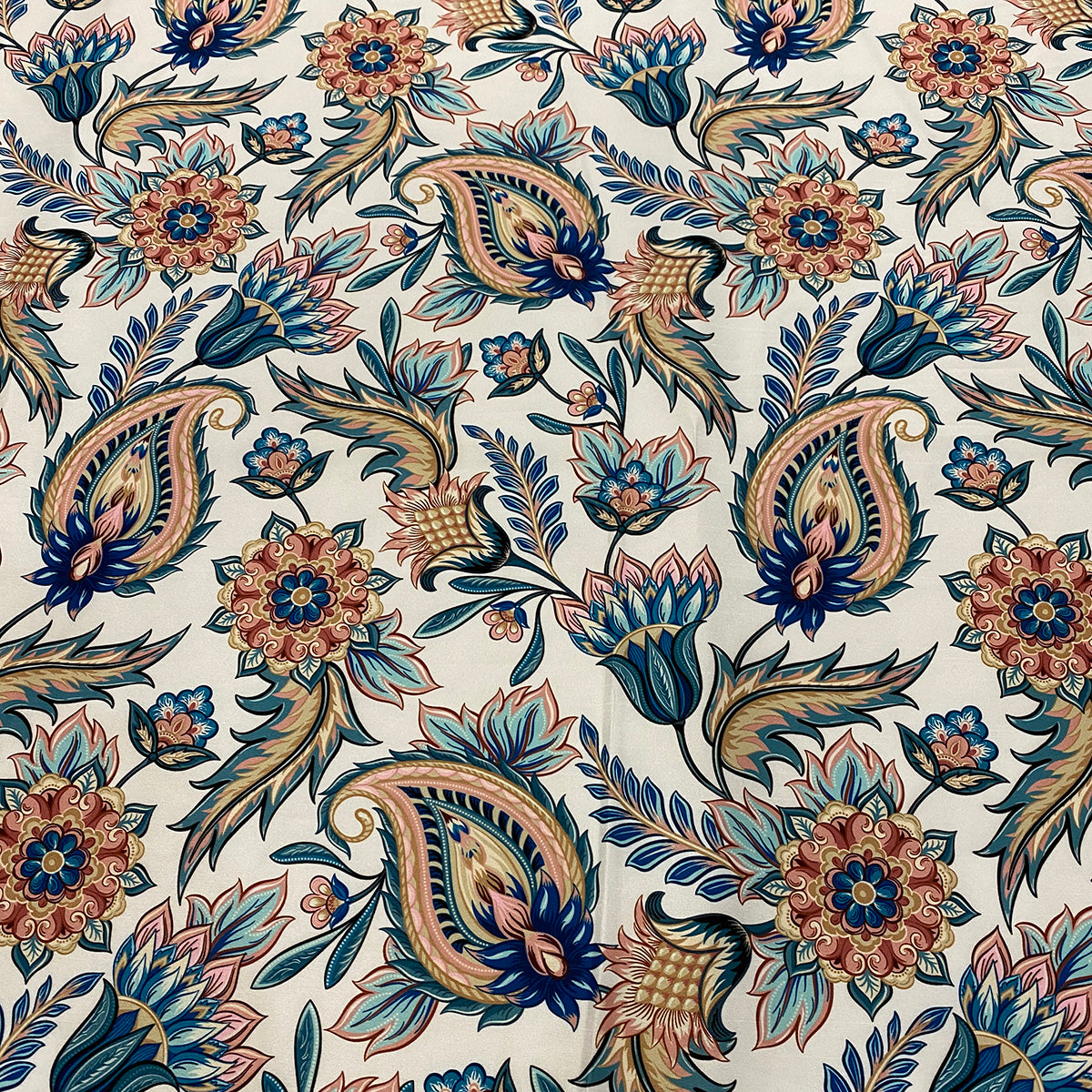 Fabric Collection: This fabric has a 100% polyester base with a Dupioni finish and an Asian Paisley print throughout.