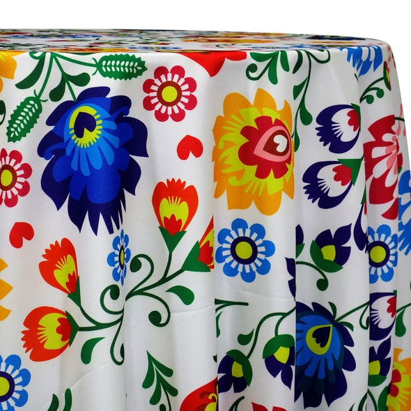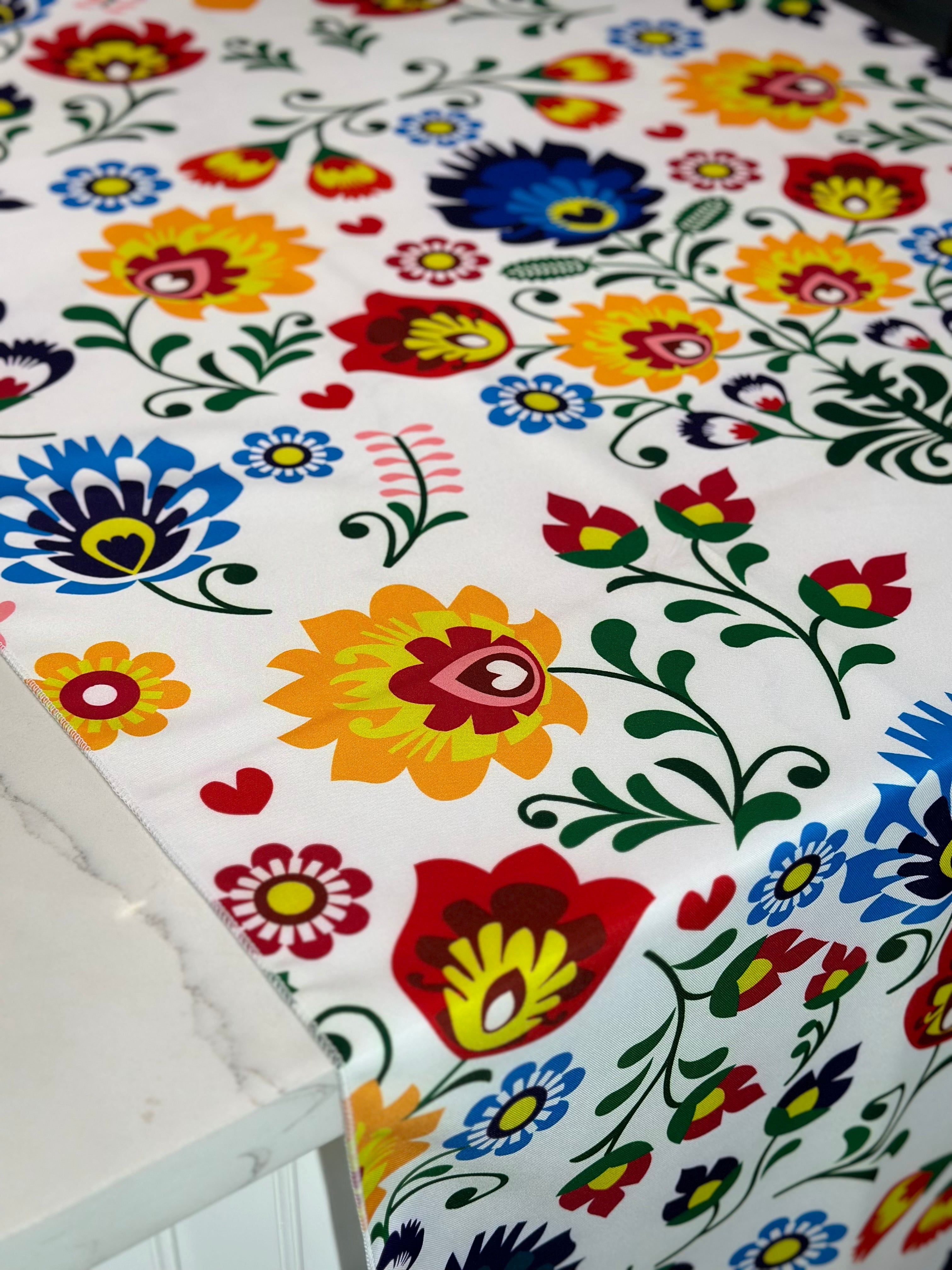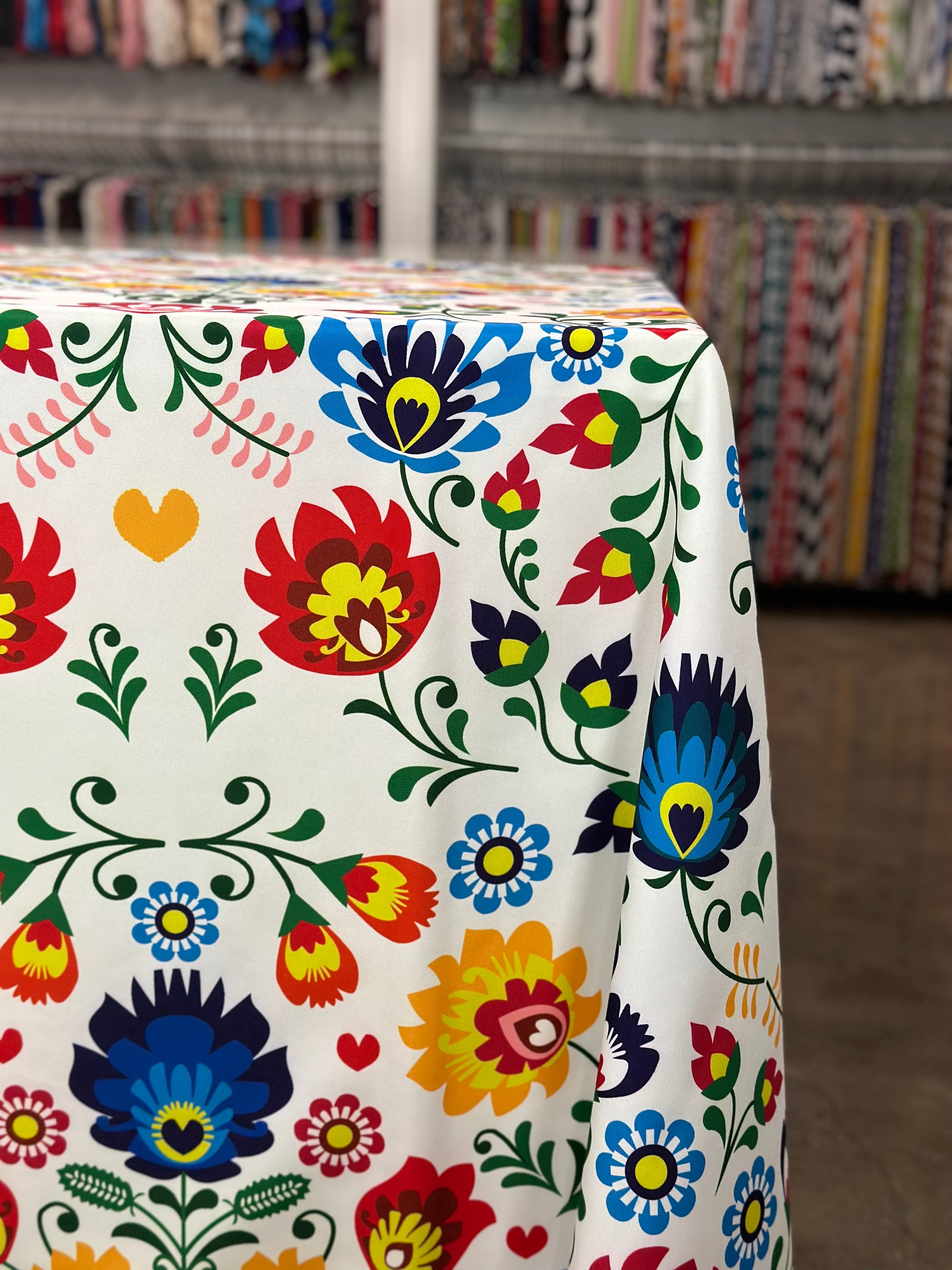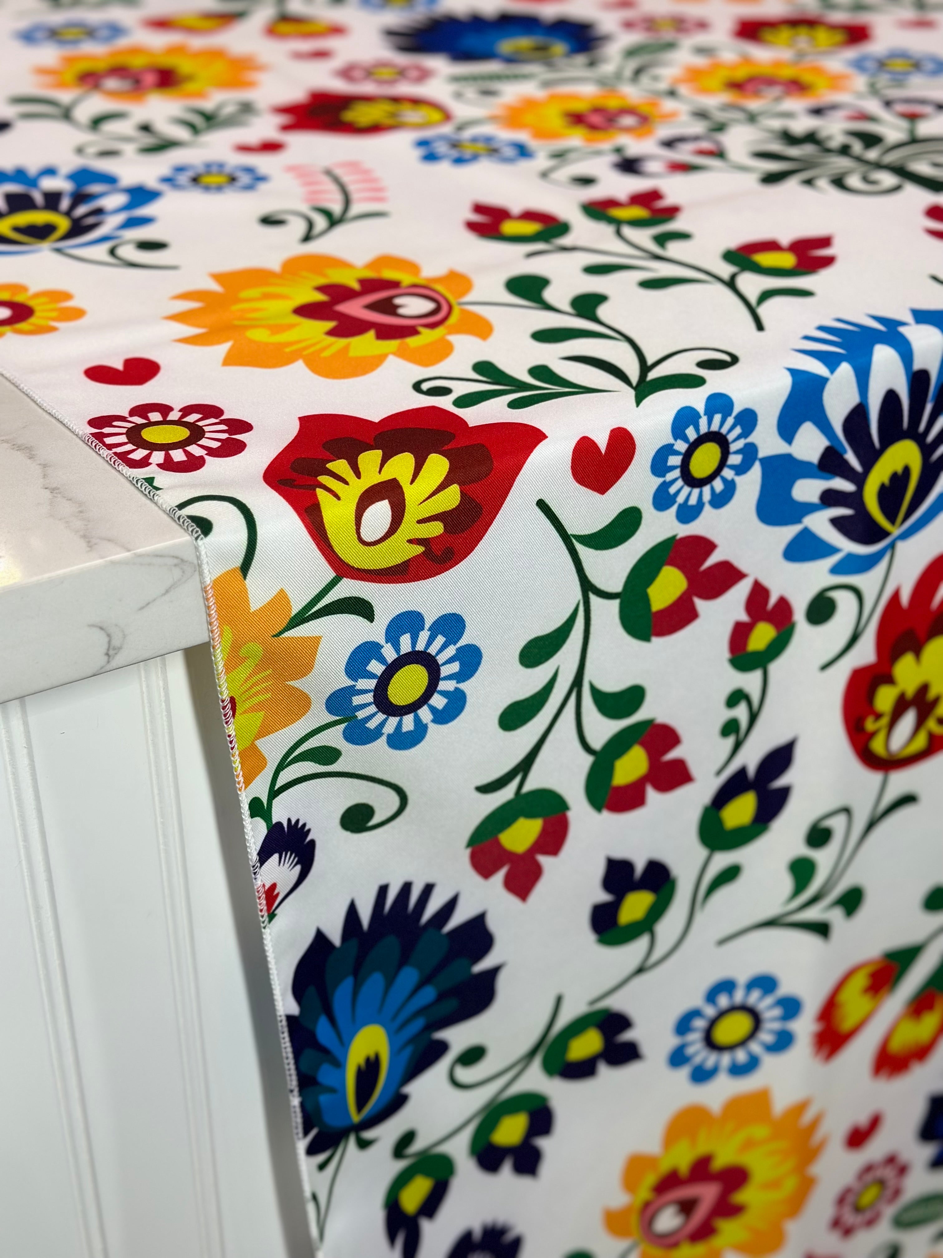 Fabric Collection: This fabric is a polyester base with our colorful "Flower Hoop" print throughout