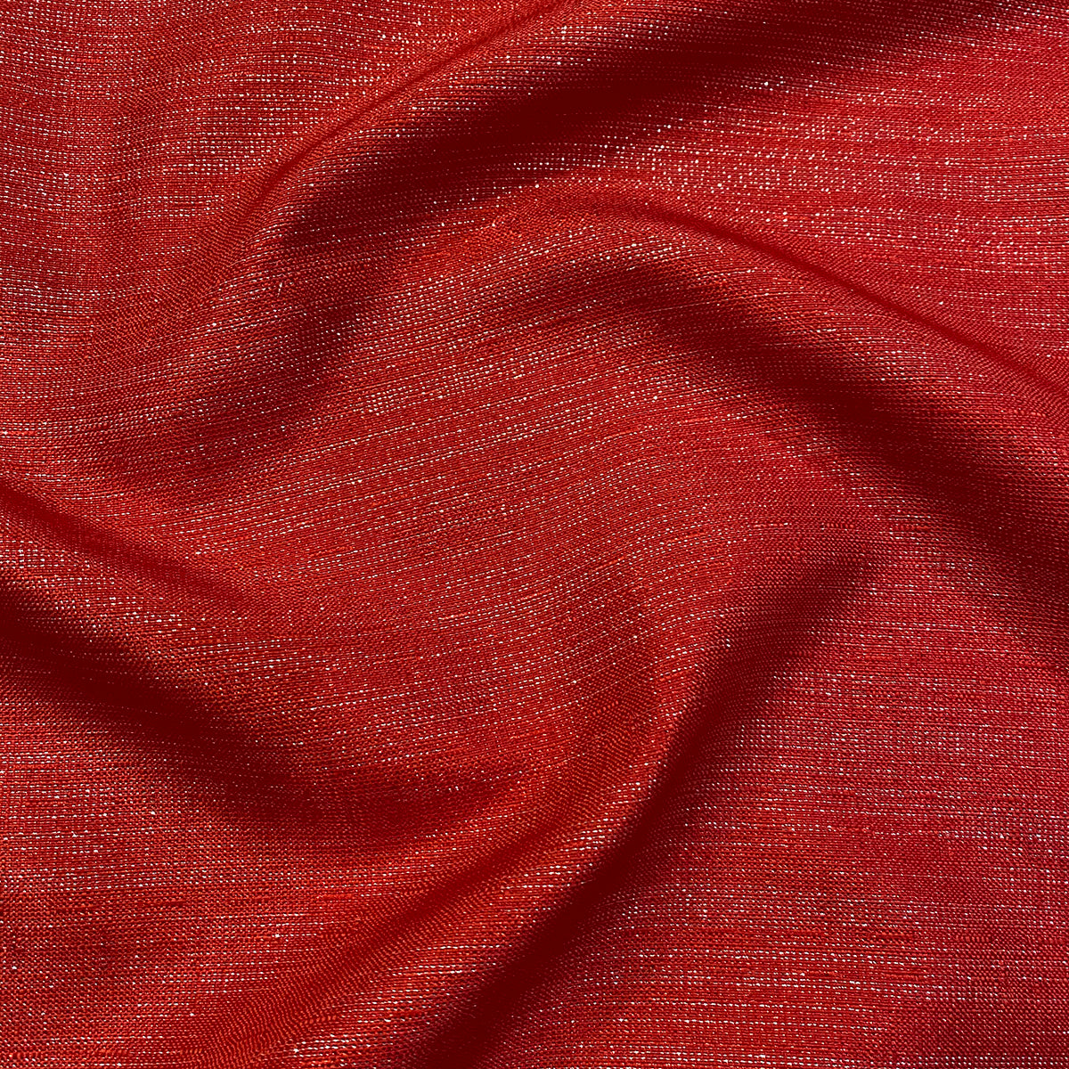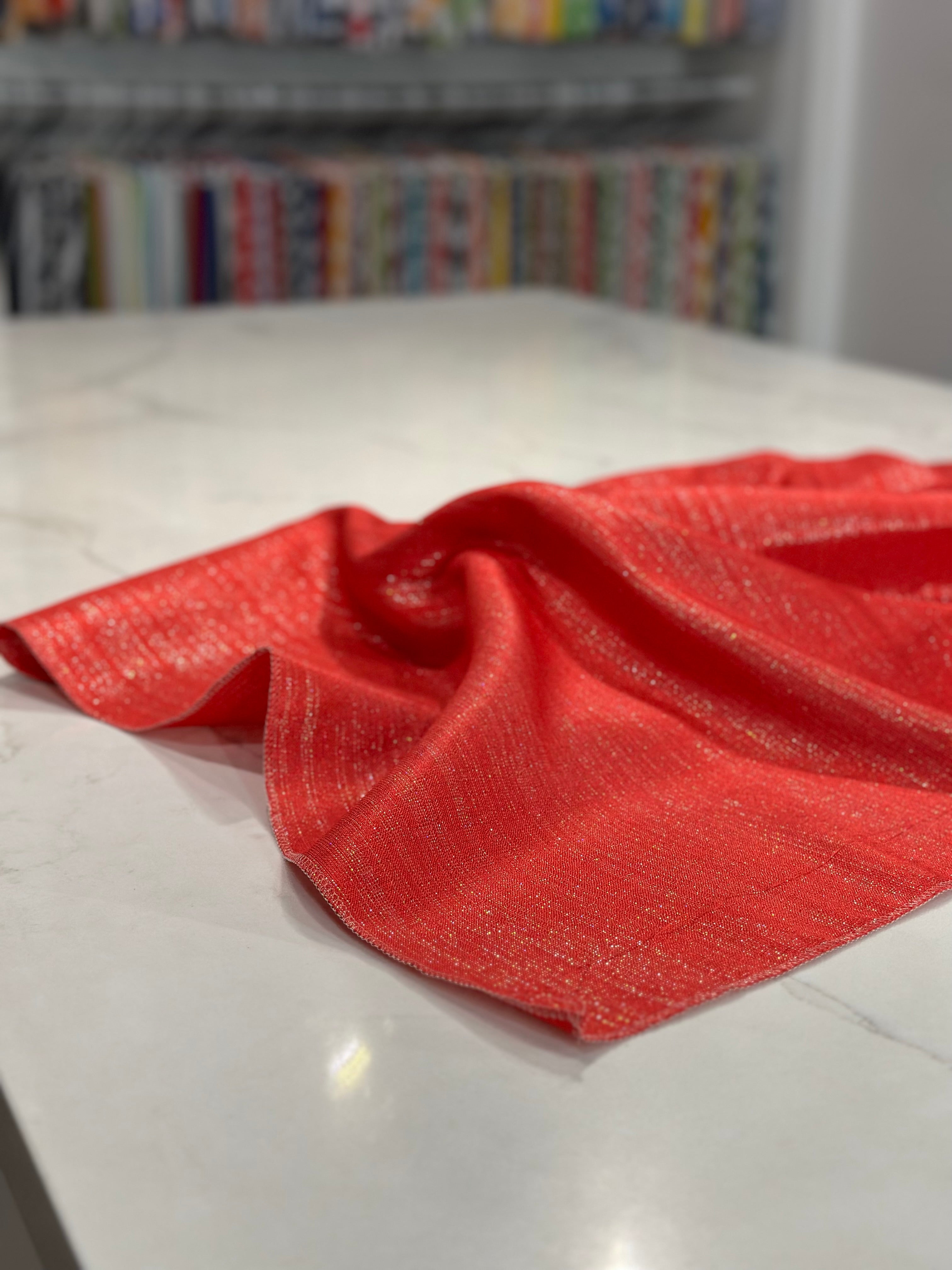 Fabric Collection: This fabric has a burlap texture/design throughout and is made from polyester so it's easy to care for. It also has metallic threading to give it an elegant upgrade vs the traditional burlap look - This fabric is in a red color with silver metallic threading mixed in.