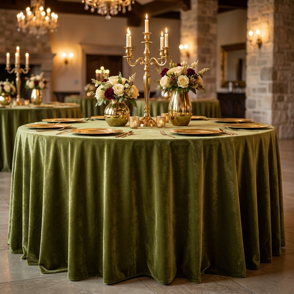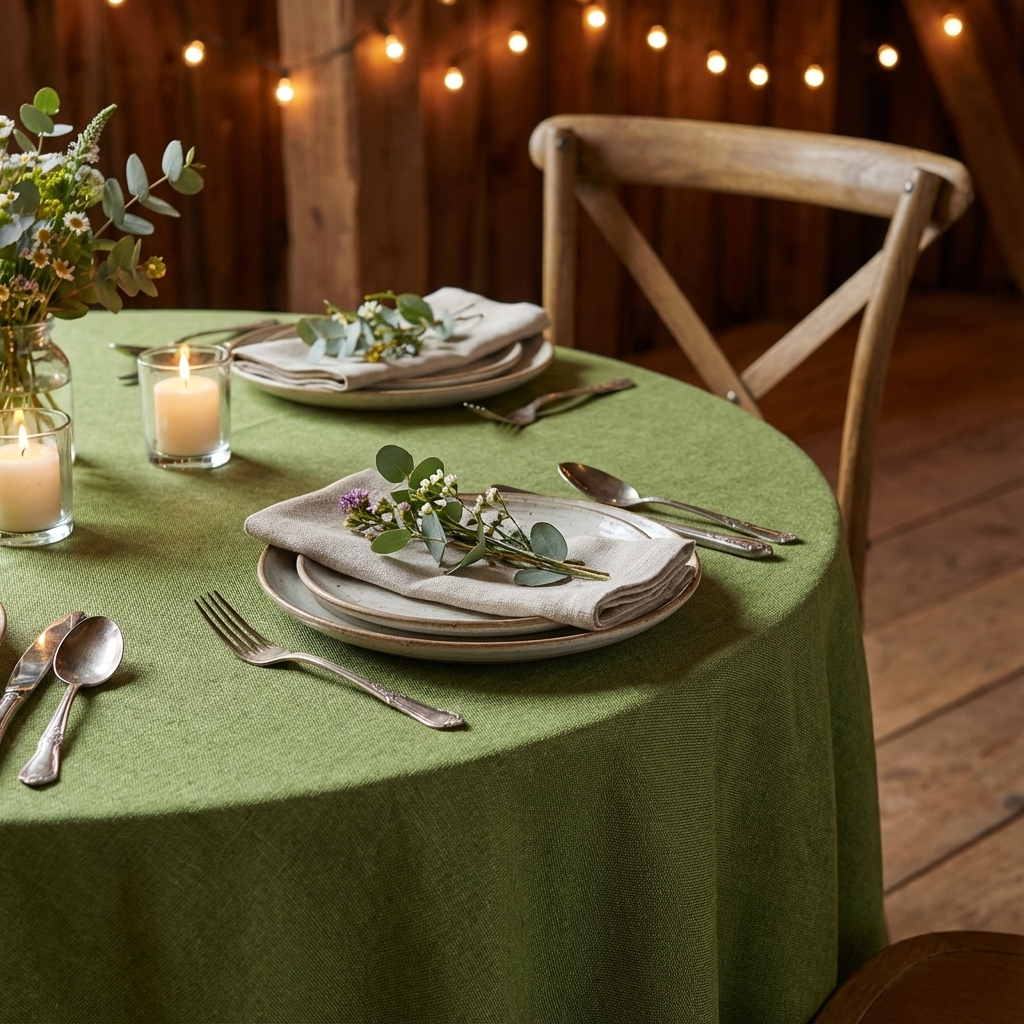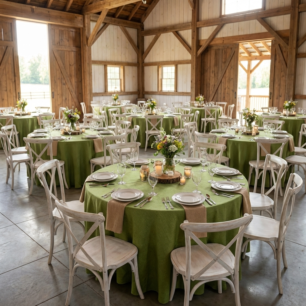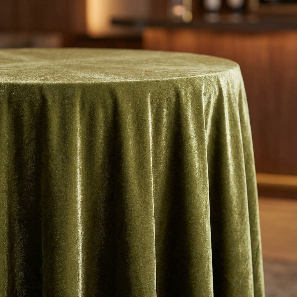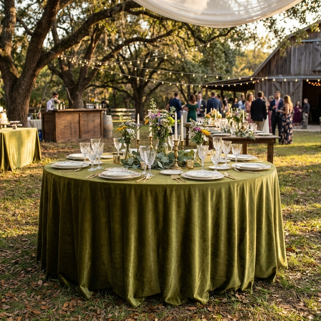 Willow Green / Olive Tablecloths are available in a wide range of fabrics to suit different event styles and settings. Some of the most popular fabrics include polyester, known for its durability and ease of care, and lamour, which offers a subtle sheen for a more upscale look. Satin is another popular choice for its smooth, glossy texture, while sheers and lace add a delicate, airy touch to any table setting. For a more rustic or bohemian vibe, burlap tablecloths provide a natural, textured look that complements outdoor or casual events.