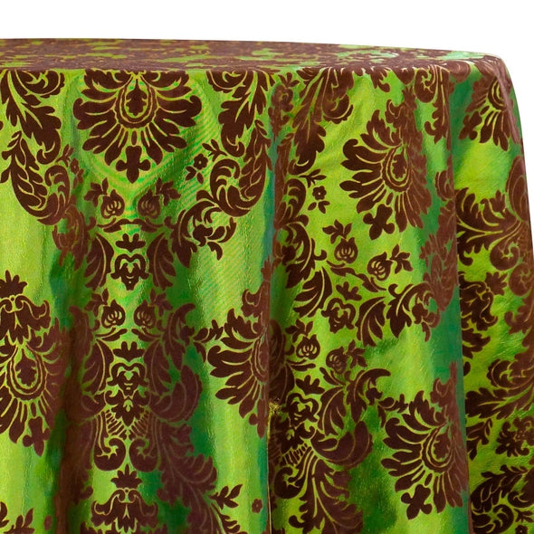 Damask Flocking Taffeta Table Linen in Brown on Olive