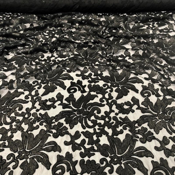 Fabric Collection: This material has a mesh/sheer base w/ sequins embroidery in our "Milan" design throughout the fabric.