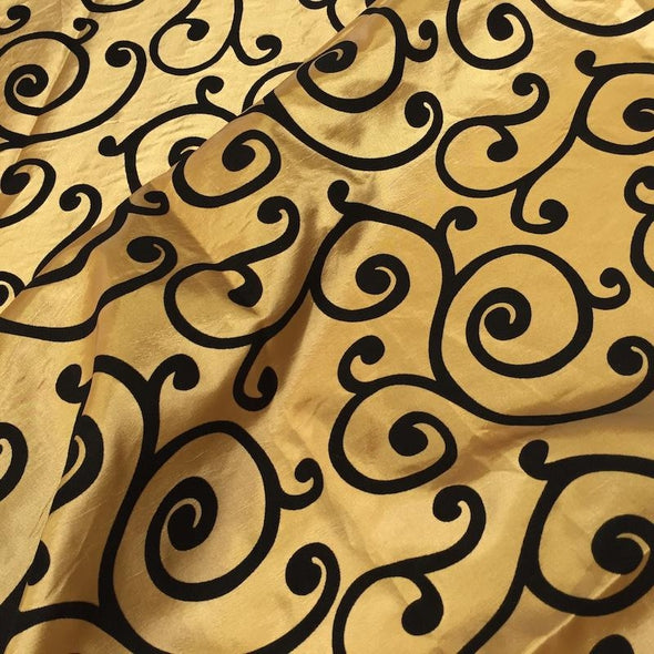Swirl Flocking Taffeta Wholesale Fabric in Black on Gold