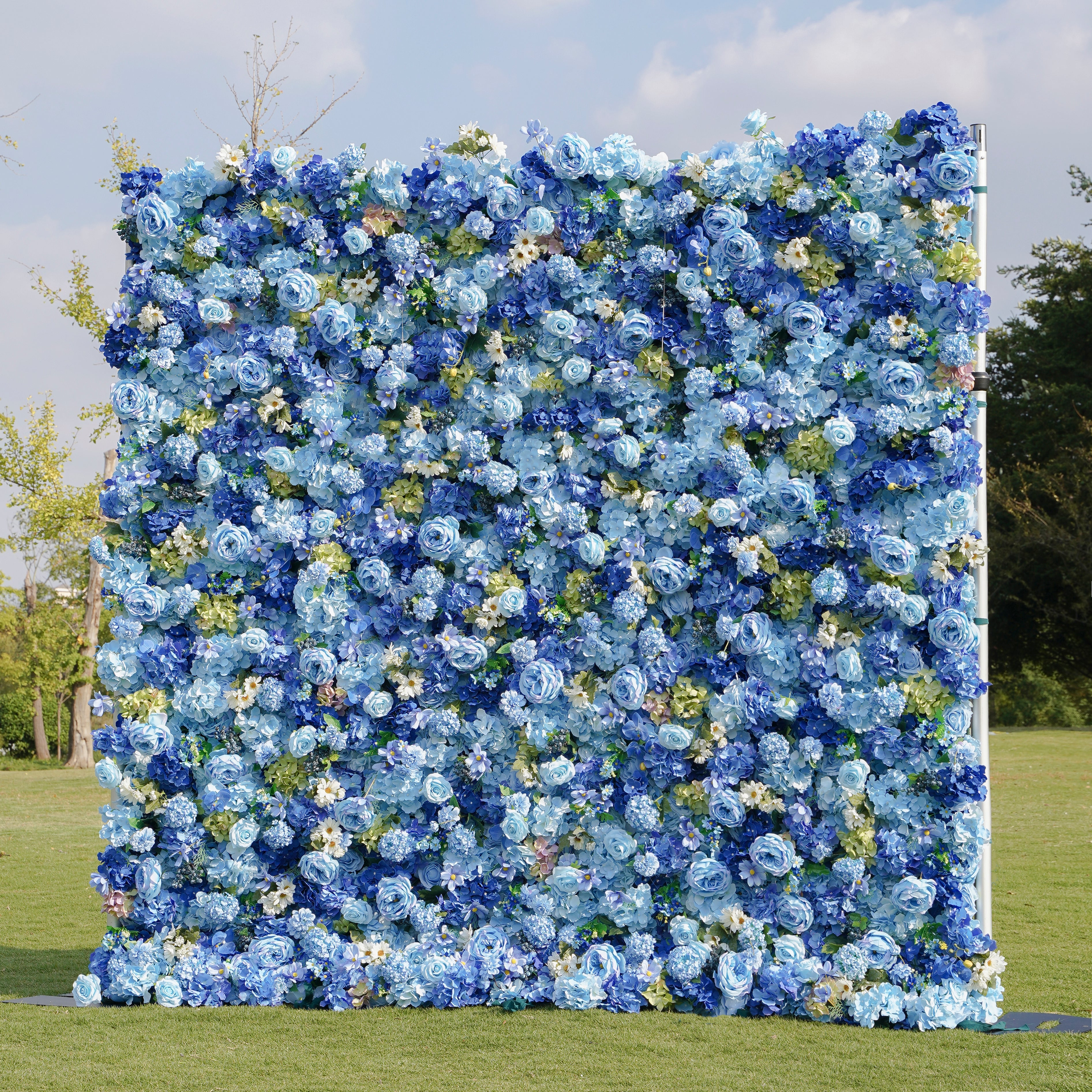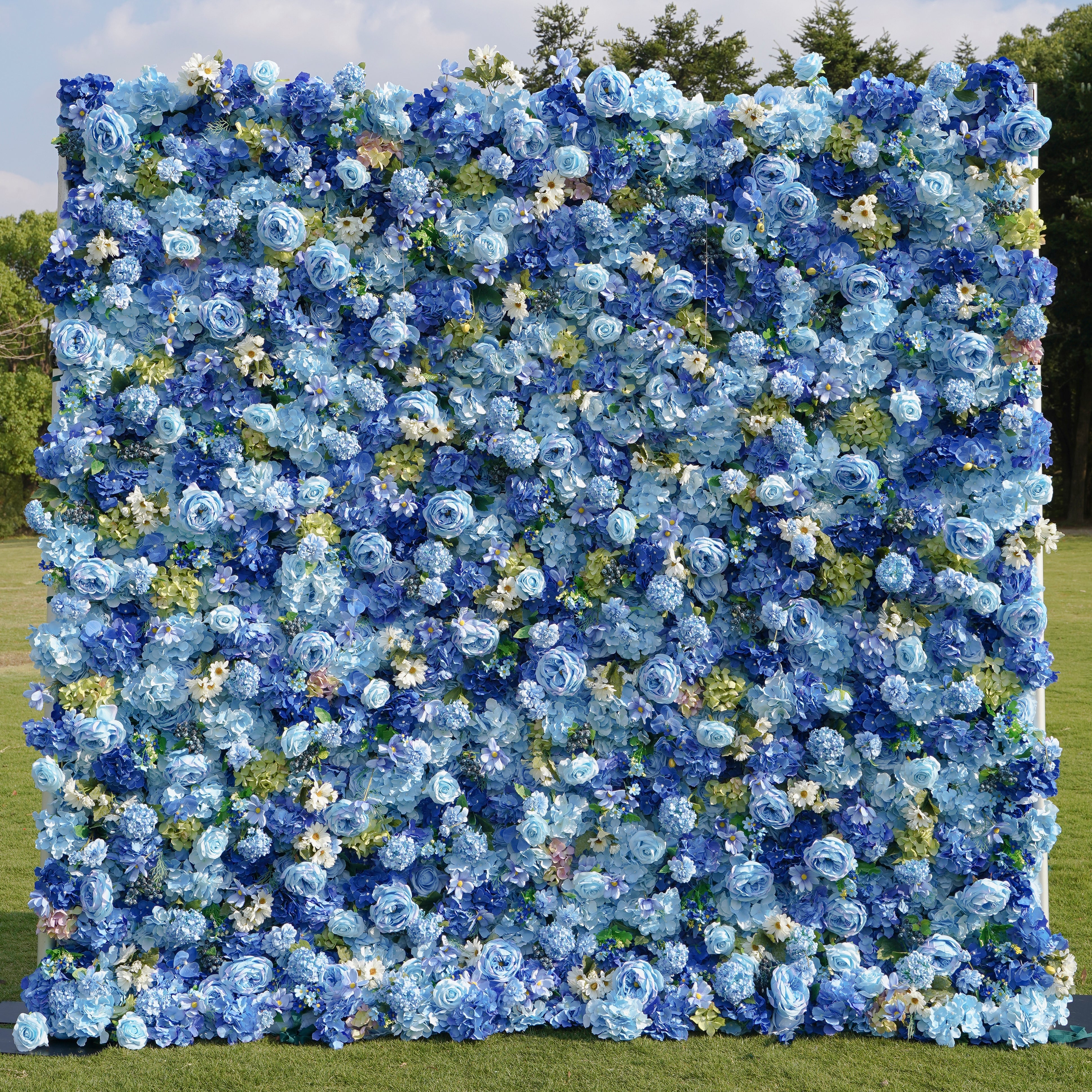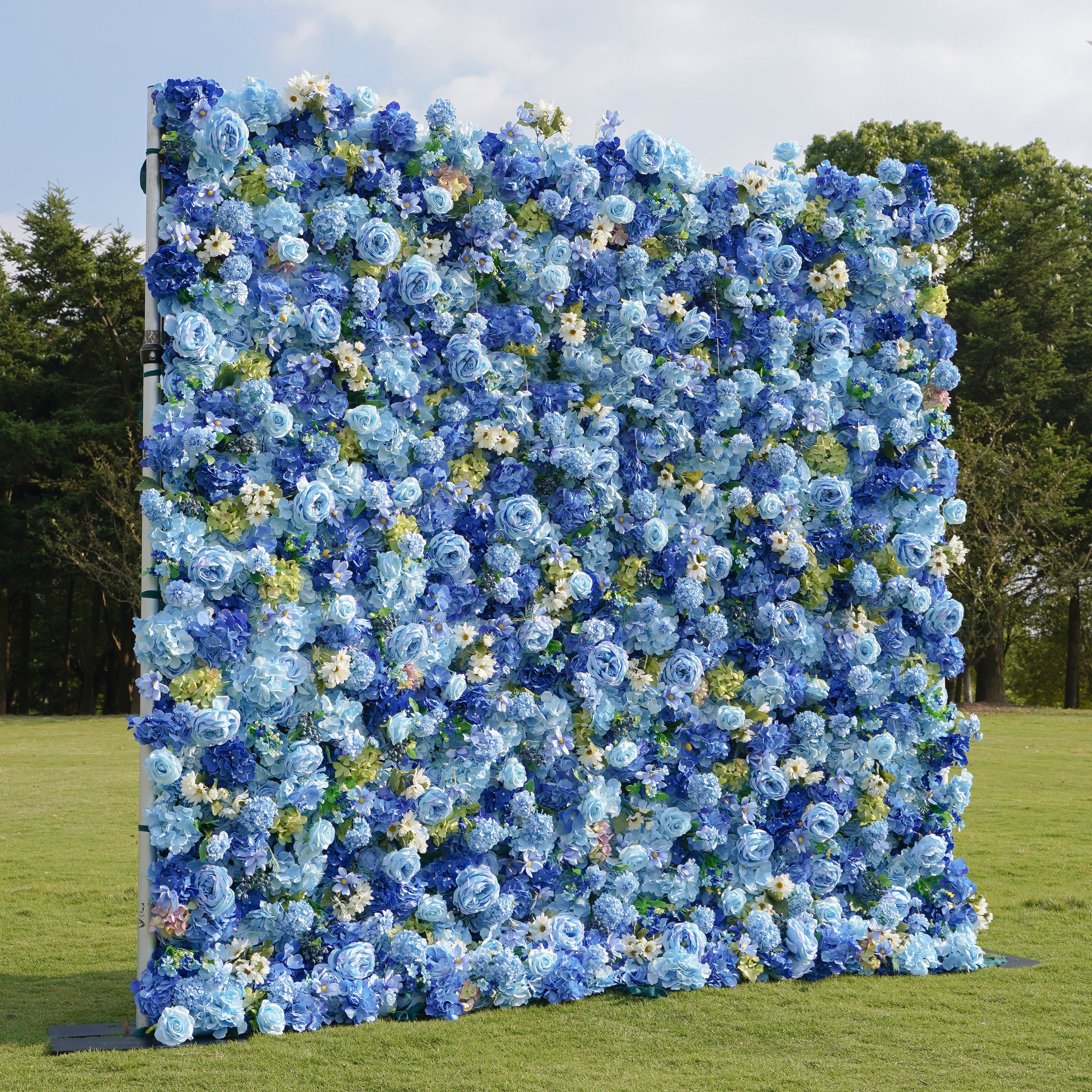 Our Blue flower wall offers a beautiful combination of Hydrangea, Rose, Daisy and Galsang flowers in bluish hues along with small accents of ivory and greenery. This item is made from high-quality materials and is densely layered to provide a stunning and long lasting Flower Wall.