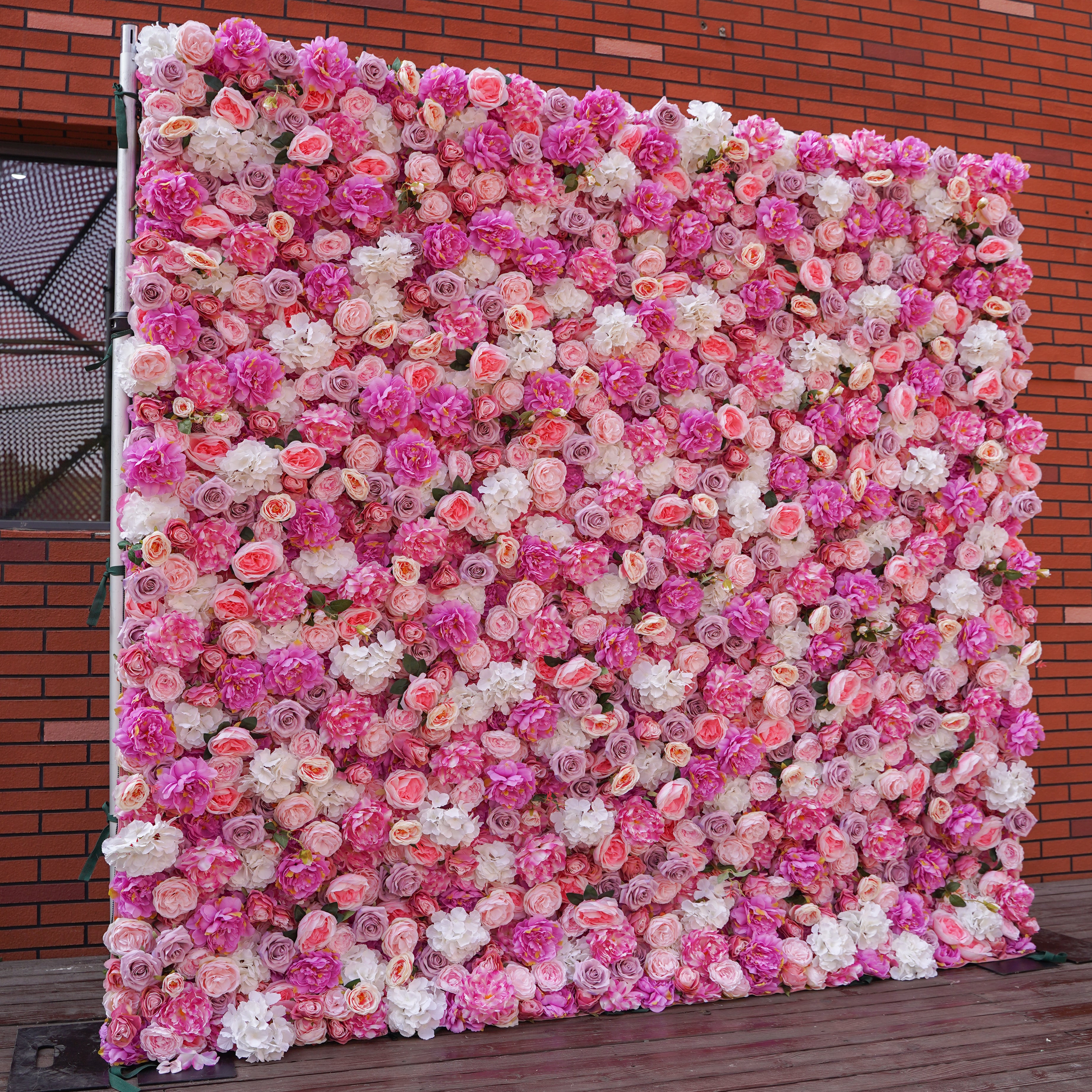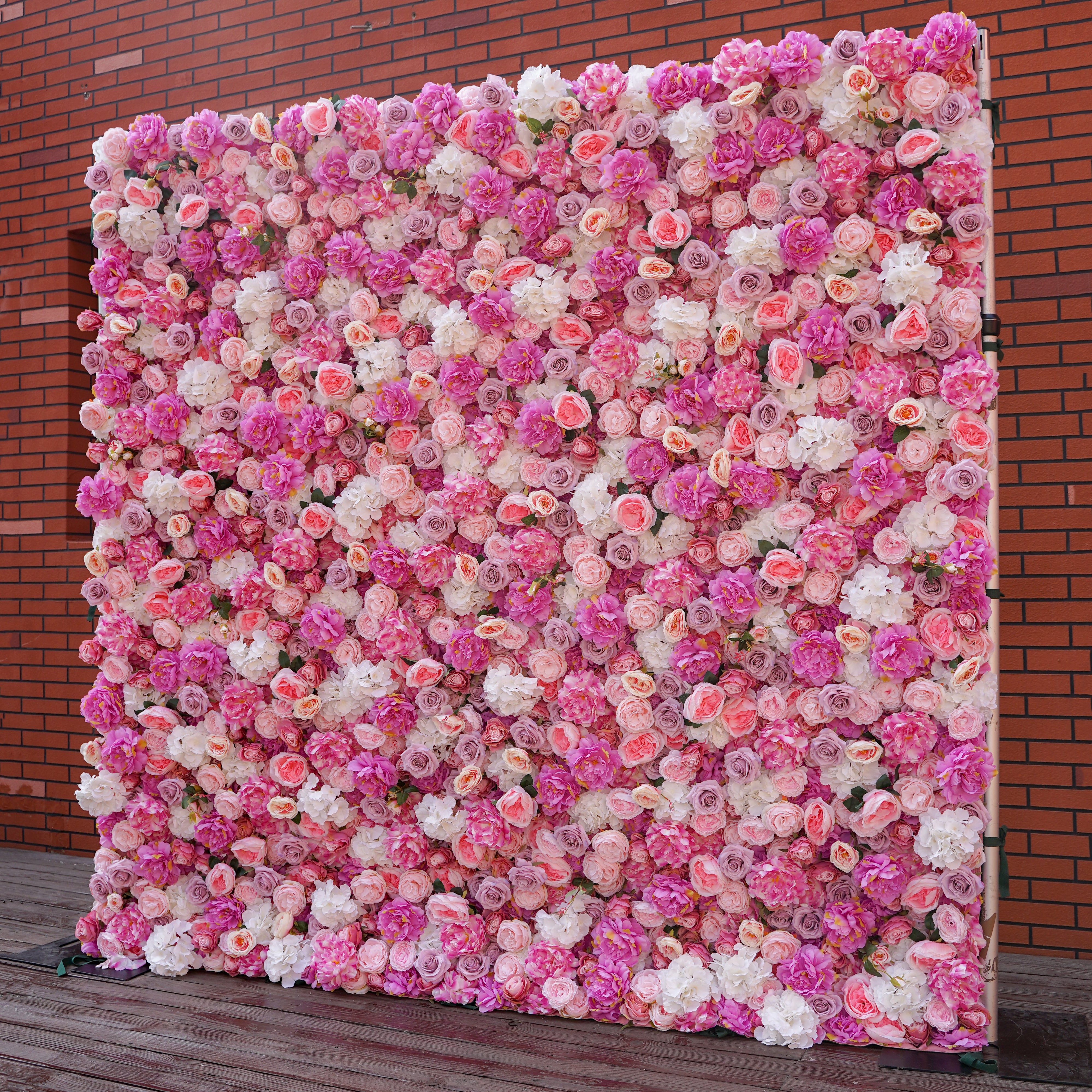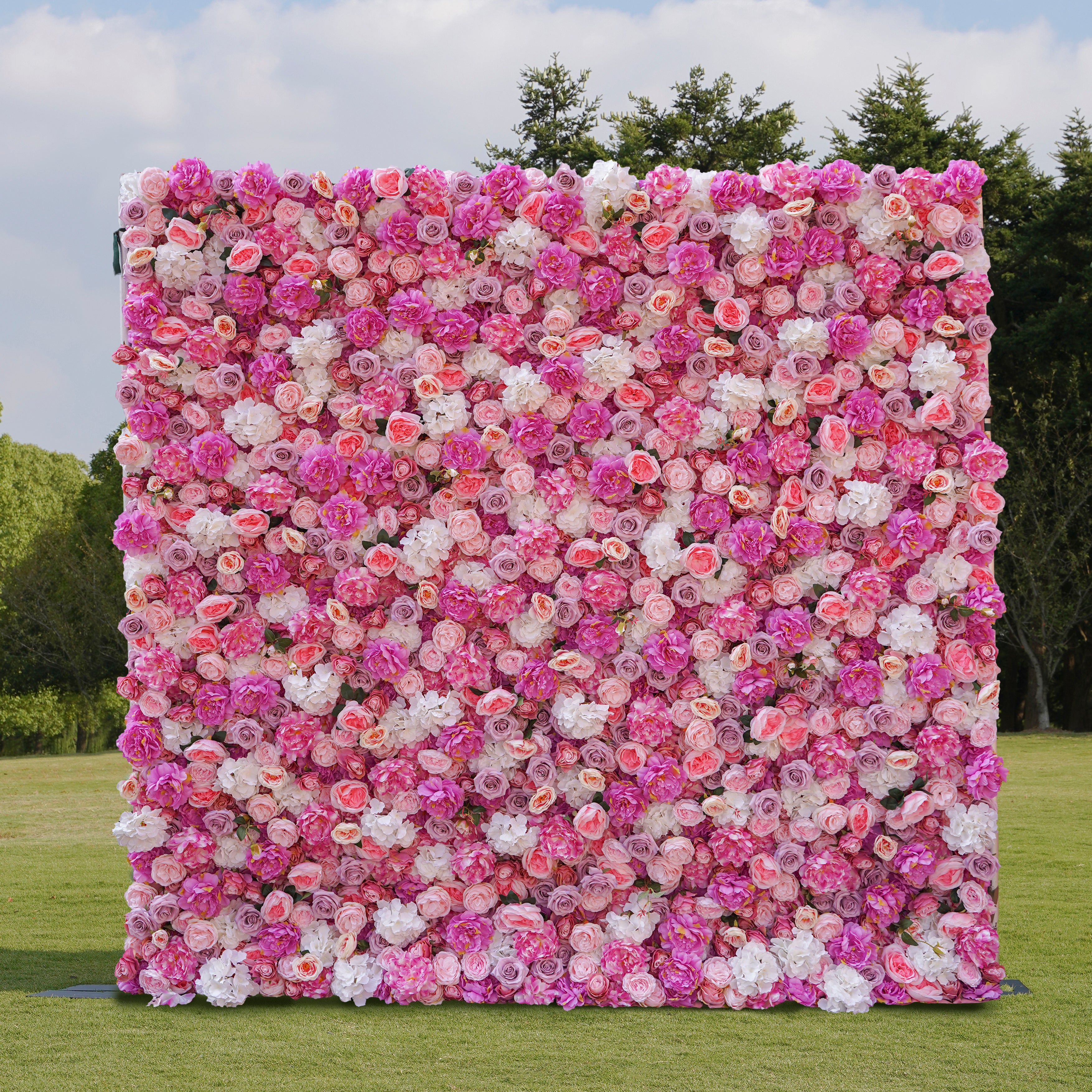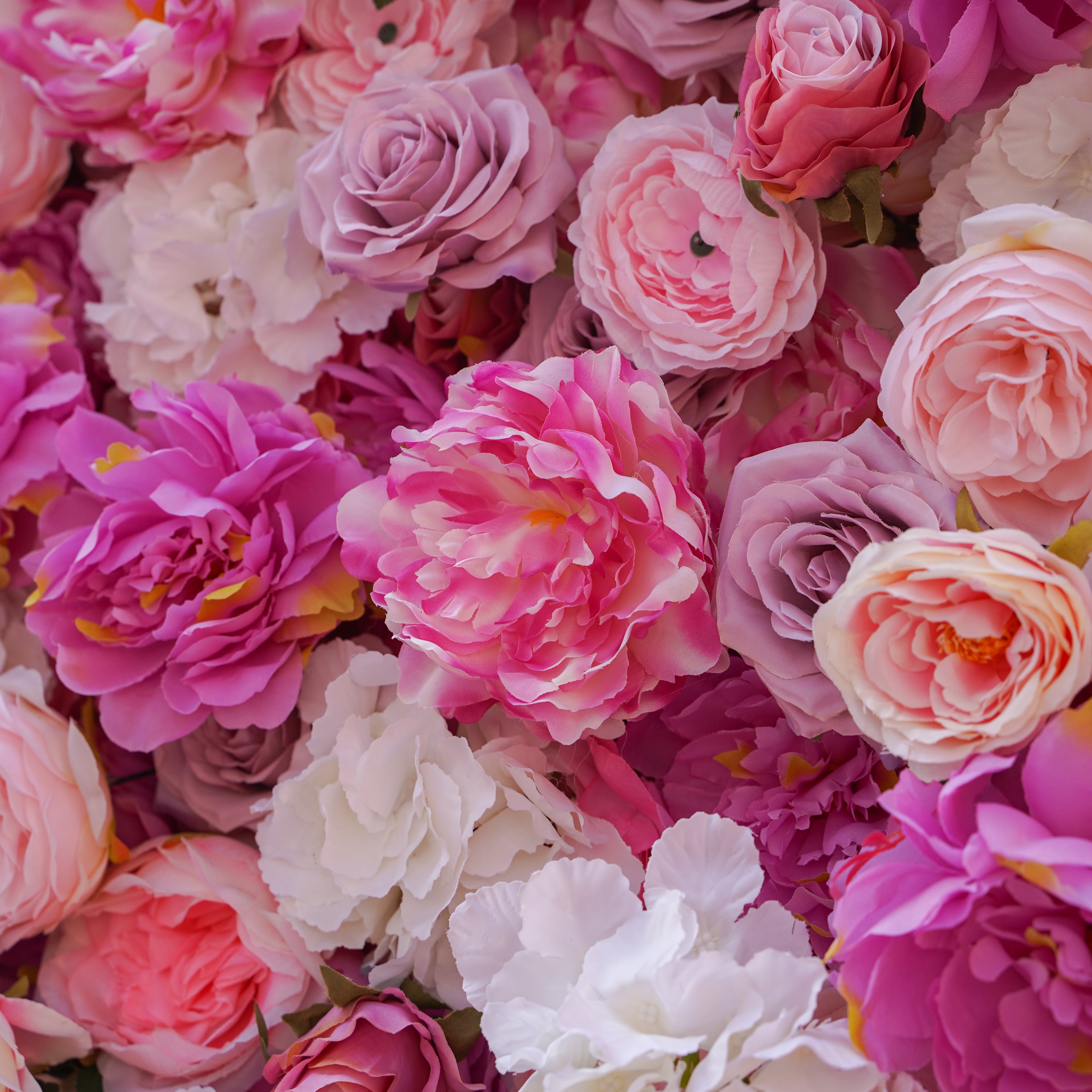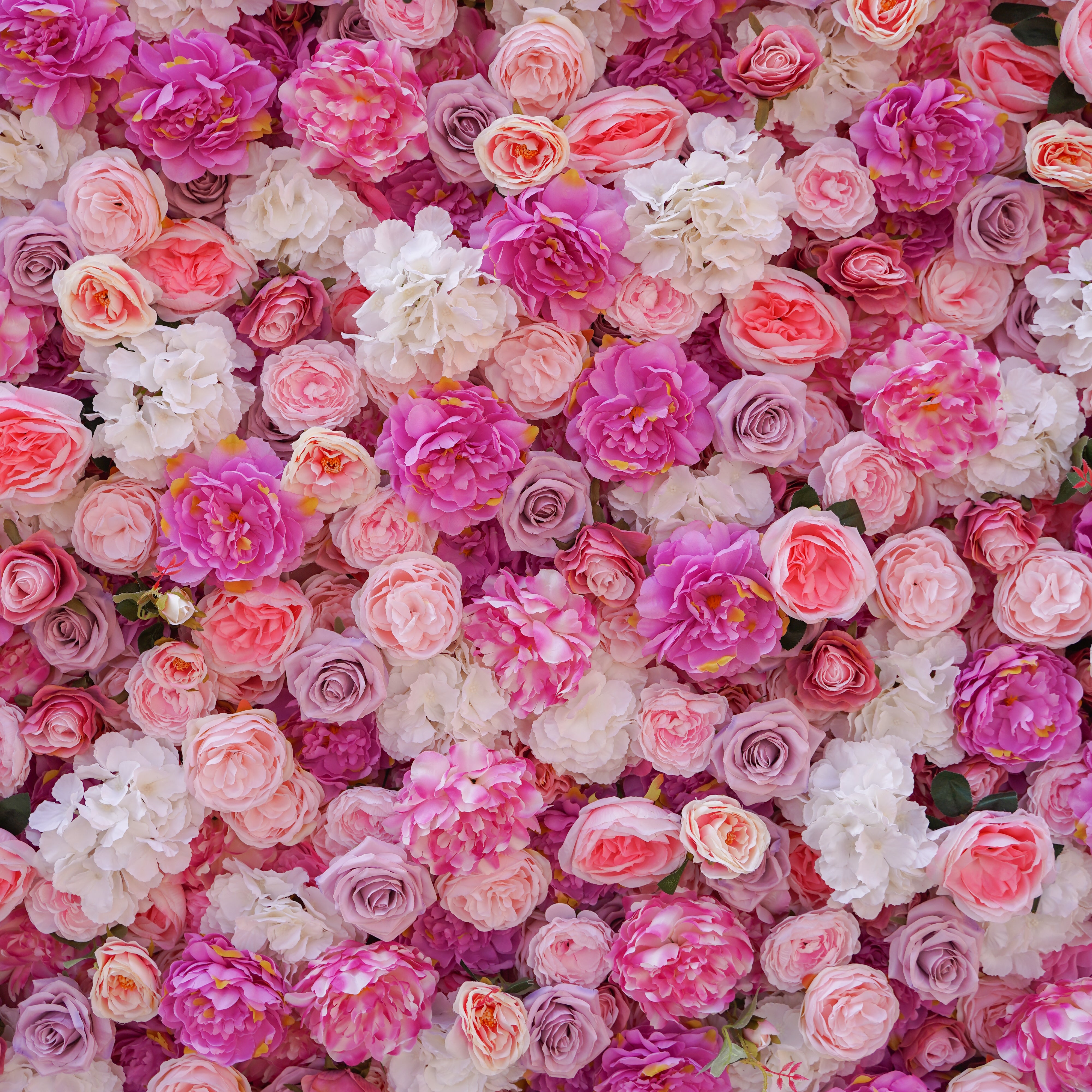 Our Ella flower wall offers a glamorous arrangement of Peony, Roses and Hydrangea flowers in pink, fuchsia, and ivory hues with small accents of greenery. This item is made from high-quality materials and is densely layered to provide a stunning and long lasting Flower Wall.