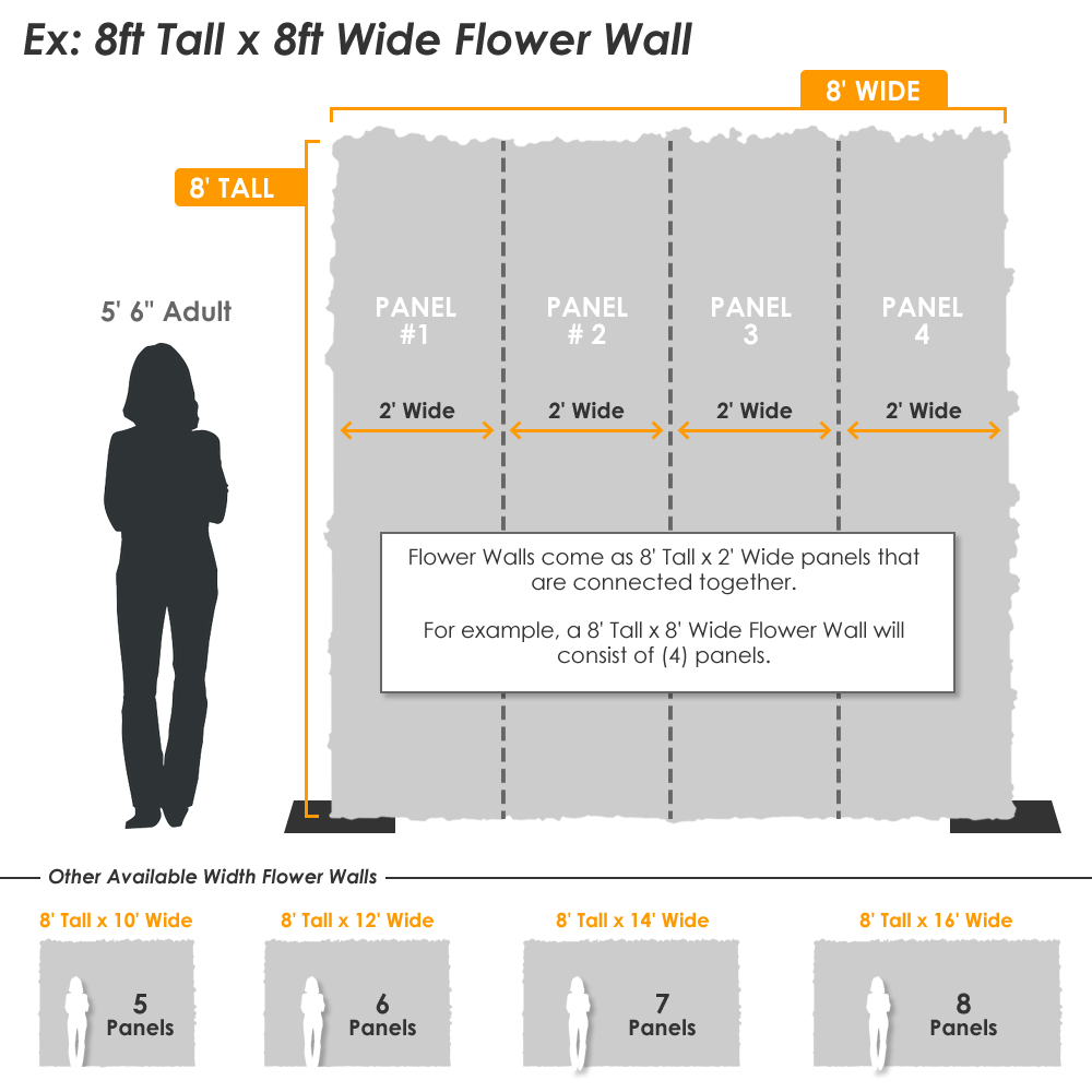 ASSEMBLY: Our Flowers Walls ship as separate panels that are 8' Tall x 2' Wide - Once assembled they'll create a 8' Tall x (Chosen Width) Flower Wall. To assemble, simply place the panels on a Crossbar (Drape Support) and connect them together using the included zippers and ties. Once connected, tie the sides of the assembled flower wall to your Uprights to secure in place.