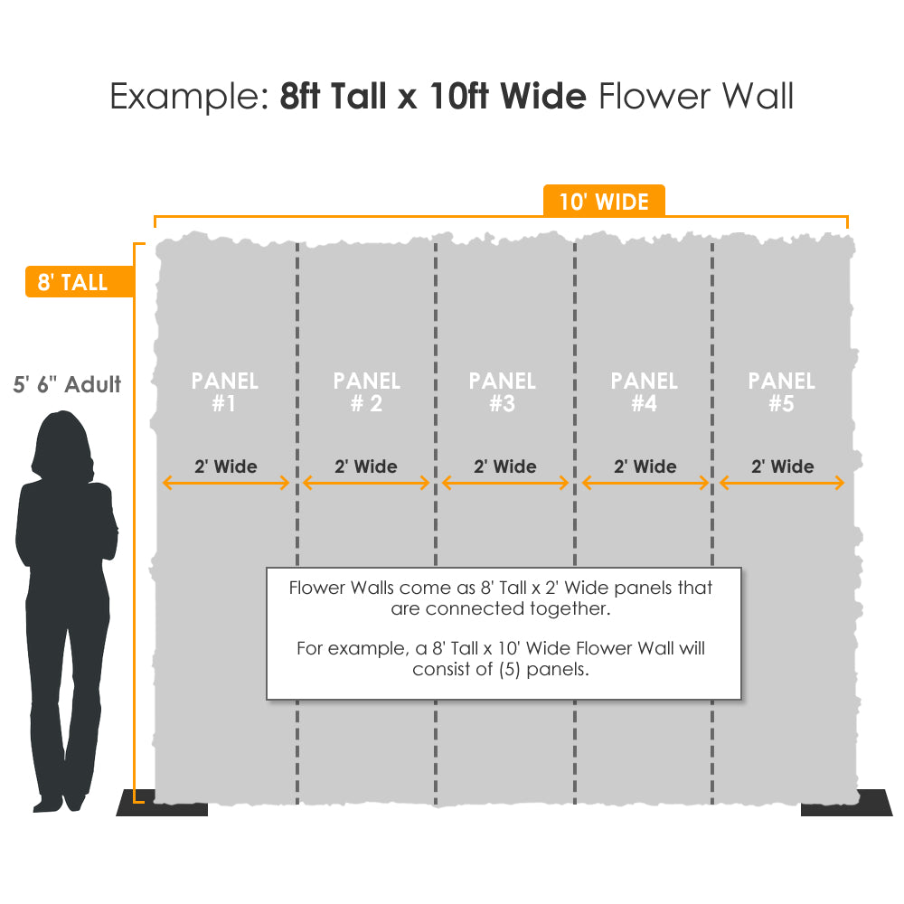 ASSEMBLY: Our Flowers Walls ship as separate panels that are 8' Tall x 2' Wide - Once assembled they'll create a 8' Tall x (Chosen Width) Flower Wall. To assemble, simply place the panels on a Crossbar (Drape Support) and connect them together using the included zippers and ties. Once connected, tie the sides of the assembled flower wall to your Uprights to secure in place.