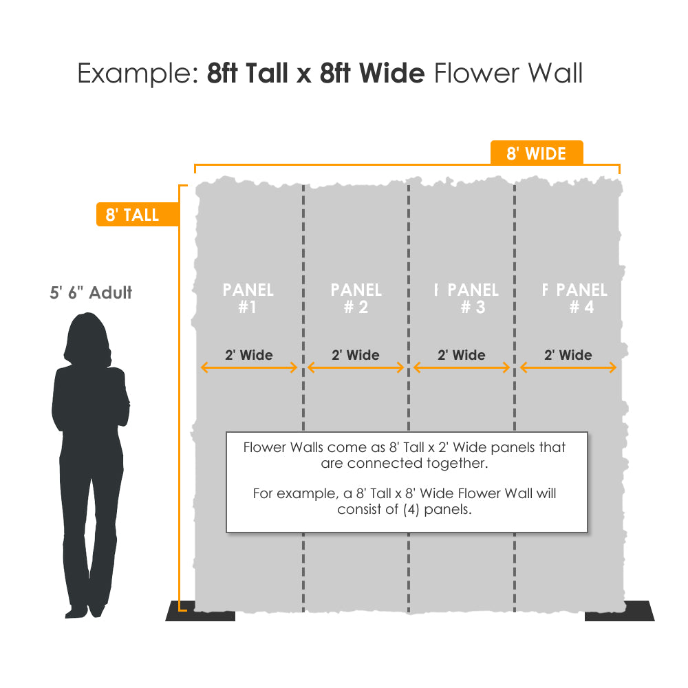 ASSEMBLY: Our Flowers Walls ship as separate panels that are 8' Tall x 2' Wide - Once assembled they'll create a 8' Tall x (Chosen Width) Flower Wall. To assemble, simply place the panels on a Crossbar (Drape Support) and connect them together using the included zippers and ties. Once connected, tie the sides of the assembled flower wall to your Uprights to secure in place.