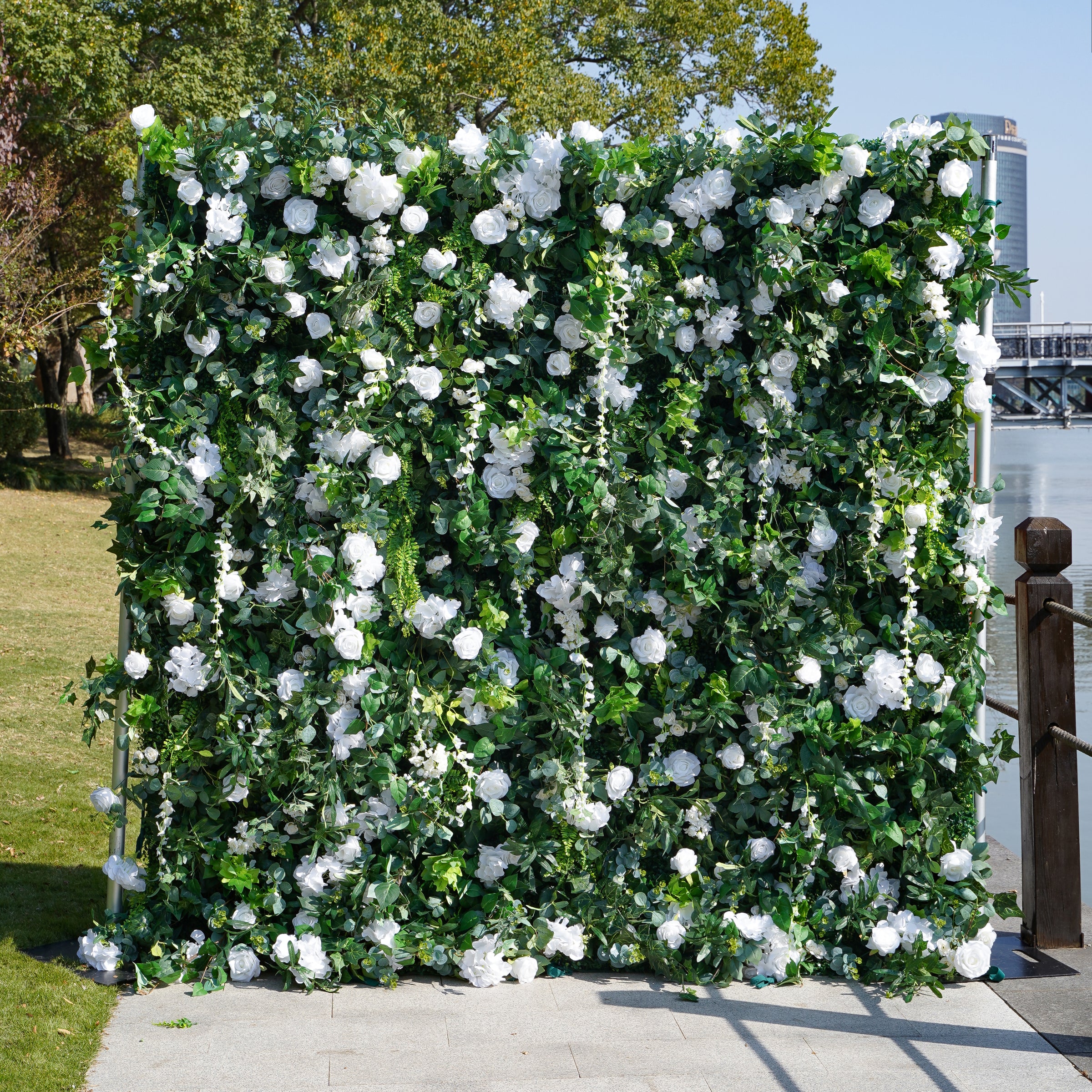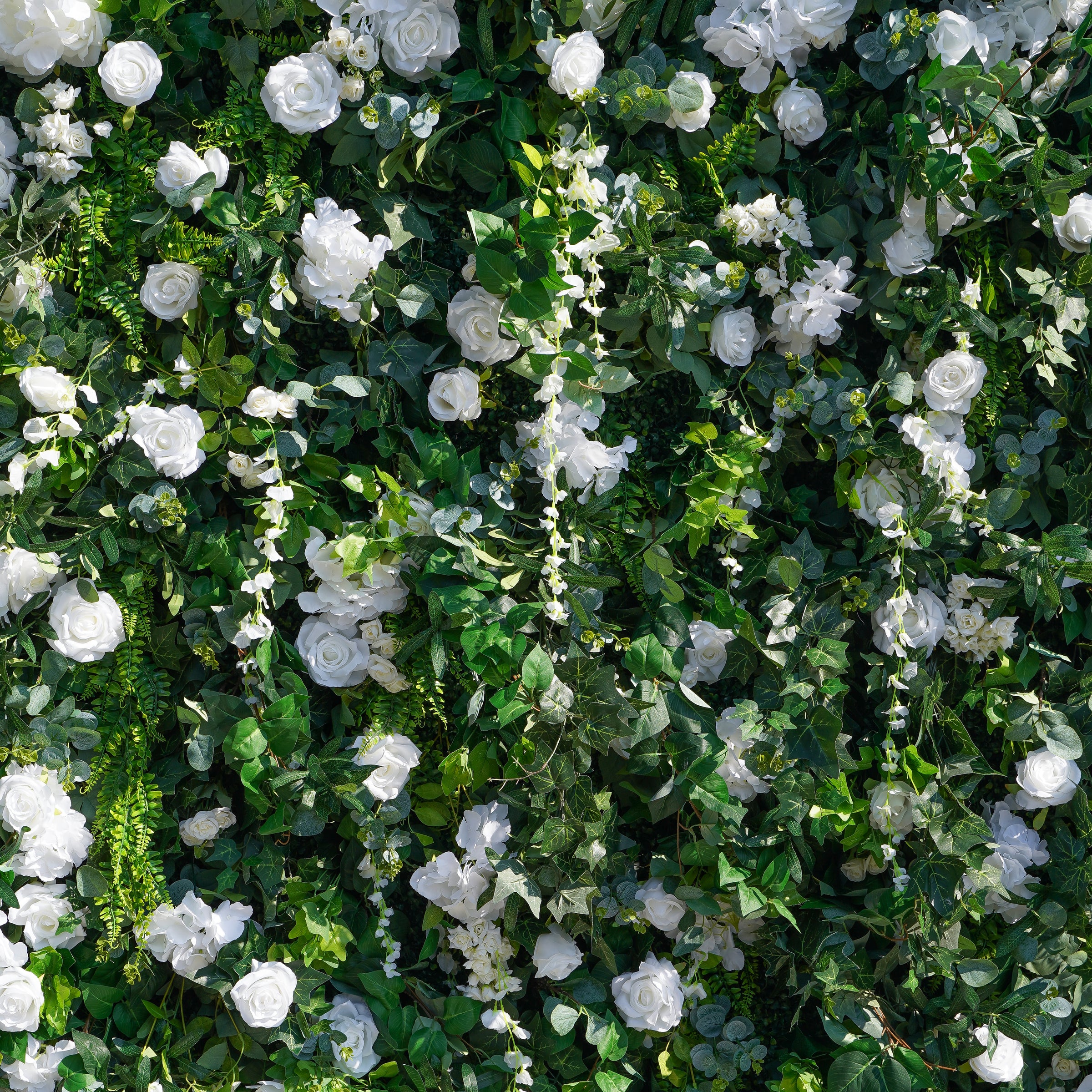 Our Spring flower wall offers a whimsical combination of Green vines, Olive Leaves, White Rose flowers in a greenish hue with white rose colorwave. This item is made from high-quality materials and is densely layered to provide a stunning and long lasting Flower Wall.