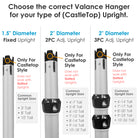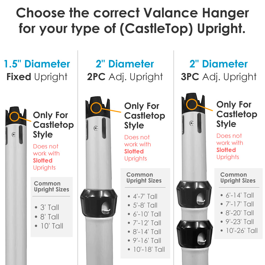 These are intended to be used with uprights that have a CastleTop® addon. If you're using a regular non-CastleTop® uprights, browse our standard 2-Layer Valance Hanger.