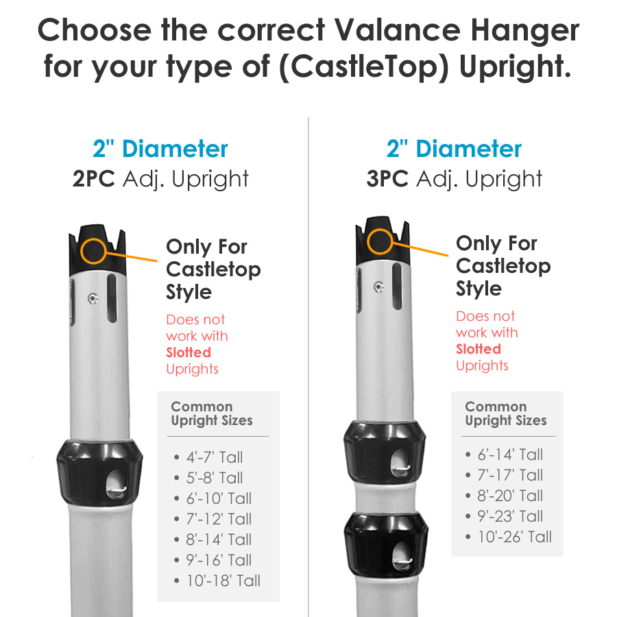 These are intended to be used with uprights that have a CastleTop® addon. If you're using a regular non-CastleTop® uprights, browse our standard 2-Layer Valance Hanger.