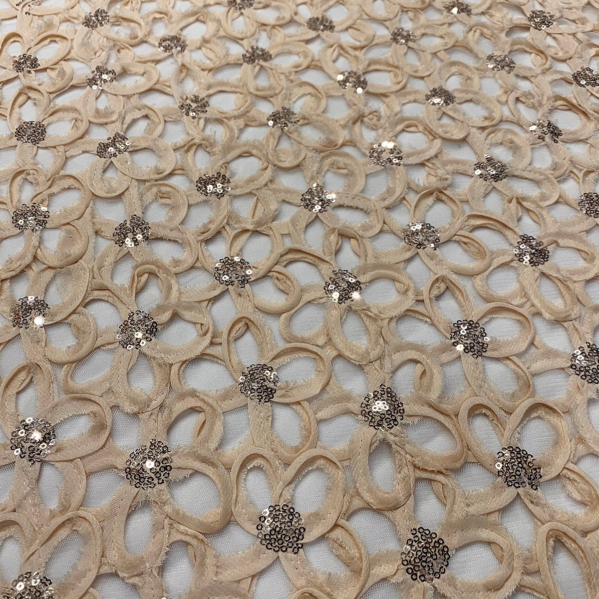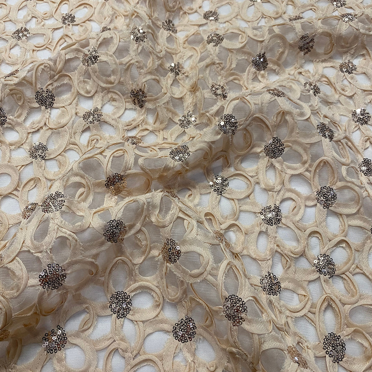 Fabric Collection: This fabric has a mesh/sheer base w/ a flower petal embroidery design w/ sequins.