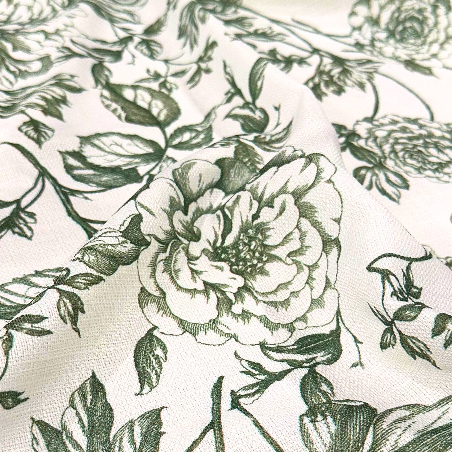 Fabric Collection: Our Artistry Bloom fabric offers a gorgeous toile de jouy vintage floral pattern on a white base. This stunning design is printed on a polyester fabric which also has a rustic slub-like textured finish.