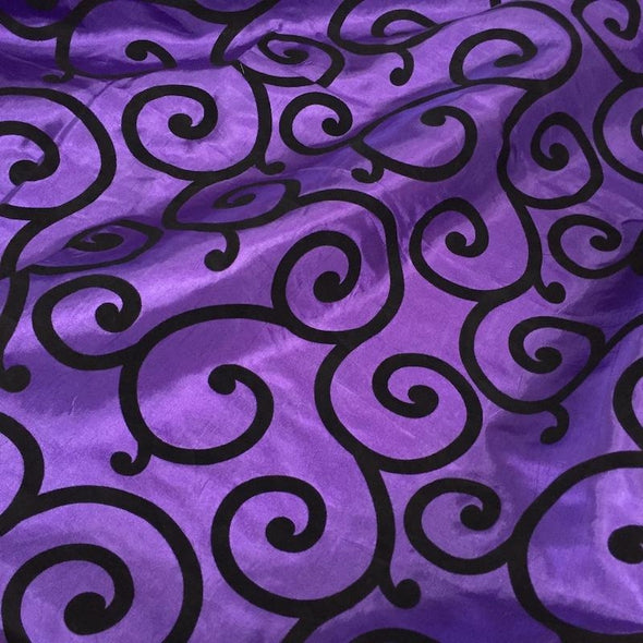 Swirl Flocking Taffeta Wholesale Fabric in Black on Purple