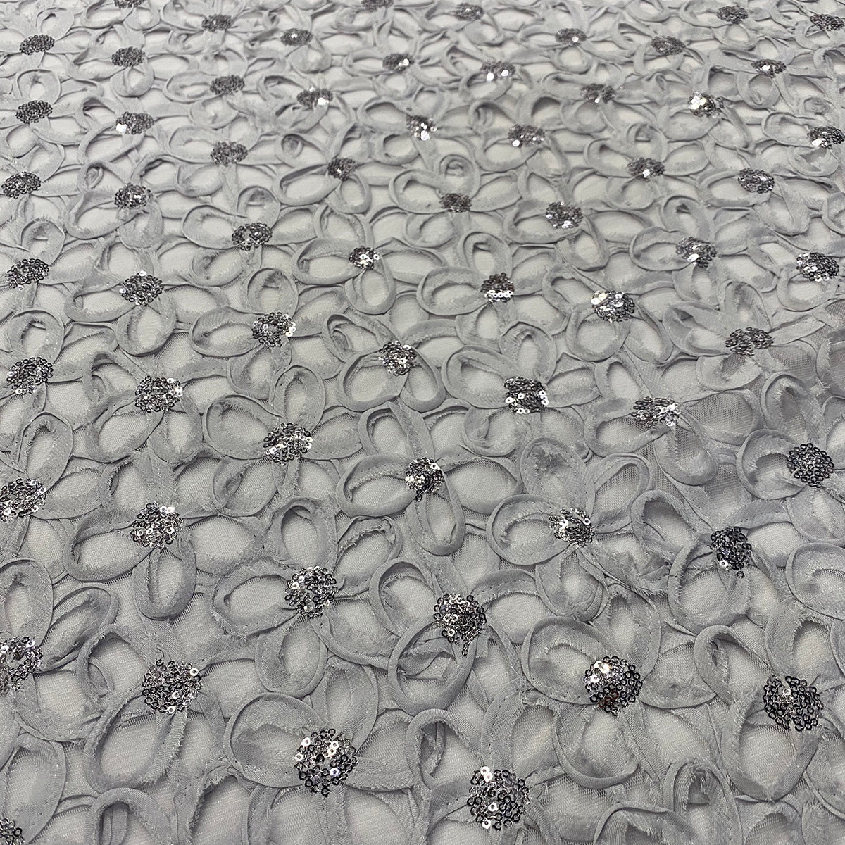 Fabric Collection: This fabric has a mesh/sheer base w/ a flower petal embroidery design w/ sequins.