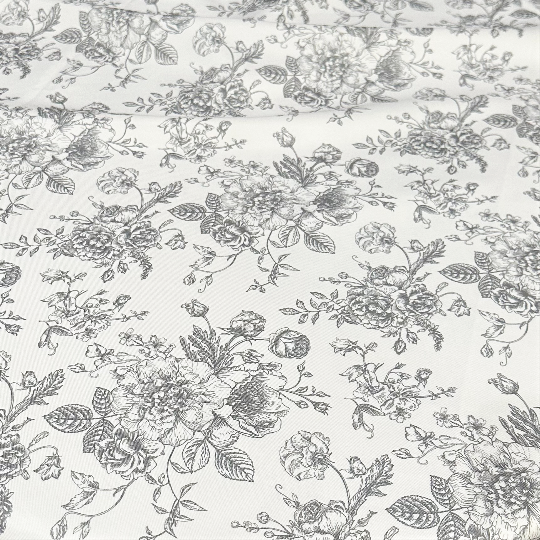 Fabric Collection: This fabric has a polyester base with our "French Toile" print in Grey color and on a White background.