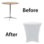 Our durable spandex chair covers fit standard 30"x30" Lowboy Tables (30" Round x 30" Tall w/ 4 Leg Base). They're made from high quality spandex with a 4-way stretch so they're easy to put on and made to last. They're also made with durable elastic foot pockets which help secure the cover in place, ensure a great fit, and help prevent damage and excess wear and tear. These covers are a perfect way to improve the look of your chair covers and ideal for rental companies, banquet halls, hotels, various venues and special events.