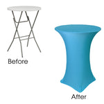 Our durable spandex chair covers fit standard 30"x42" Highboy/Cocktail Tables (30" Round x 42" Tall w/ 4 Leg Base). They're made from high quality spandex with a 4-way stretch so they're easy to put on and made to last. They're also made with durable elastic foot pockets which help secure the cover in place, ensure a great fit, and help prevent damage and excess wear and tear. These covers are a perfect way to improve the look of your chair covers and ideal for rental companies, banquet halls, hotels, various venues and special events.