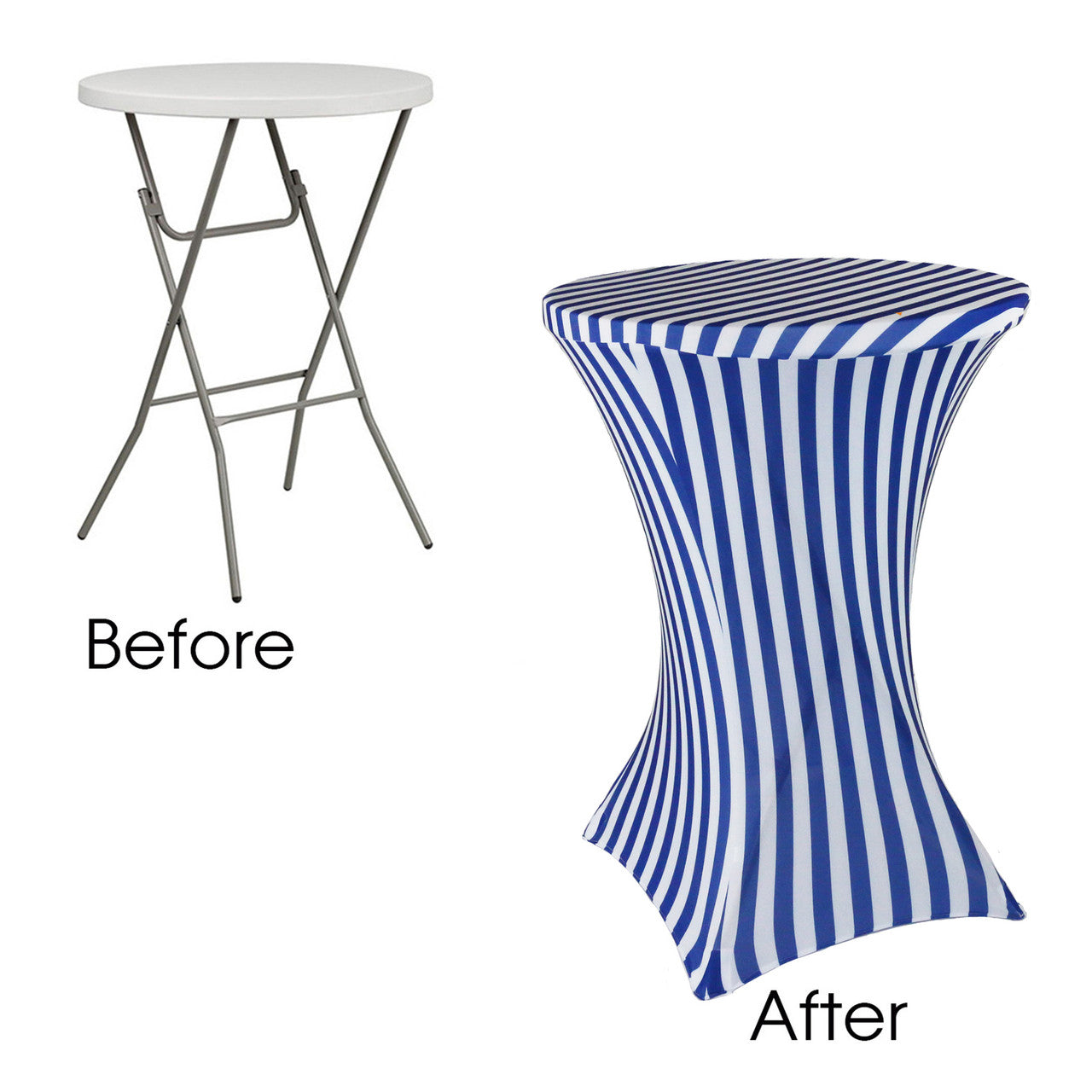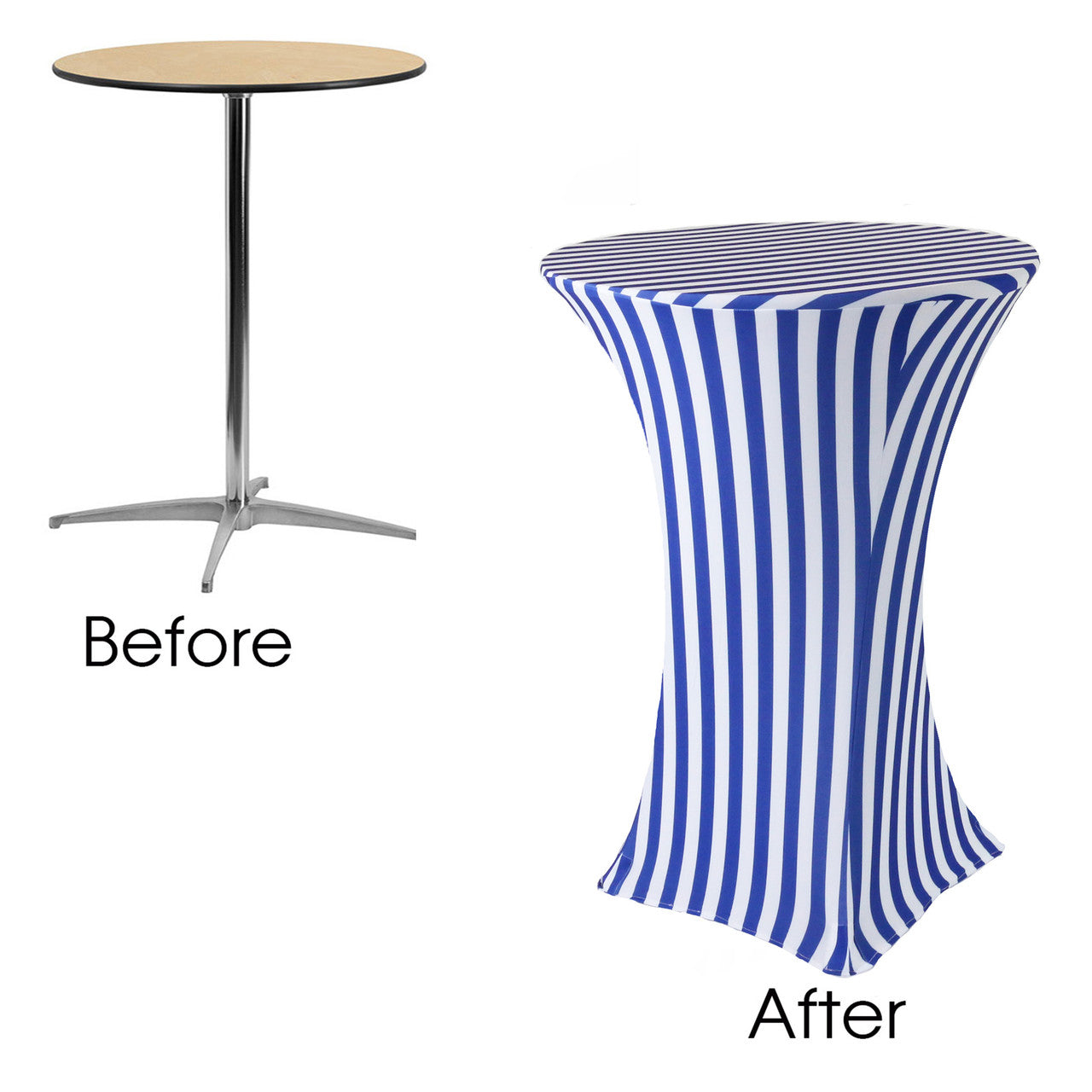 Our durable spandex chair covers fit standard 30"x42" Highboy Tables (30" Round x 42" Tall w/ 4 Leg Base). They're made from high quality spandex with a 4-way stretch so they're easy to put on and made to last. They're also made with durable elastic foot pockets which help secure the cover in place, ensure a great fit, and help prevent damage and excess wear and tear. These covers are a perfect way to improve the look of your chair covers and ideal for rental companies, banquet halls, hotels, various venues and special events.