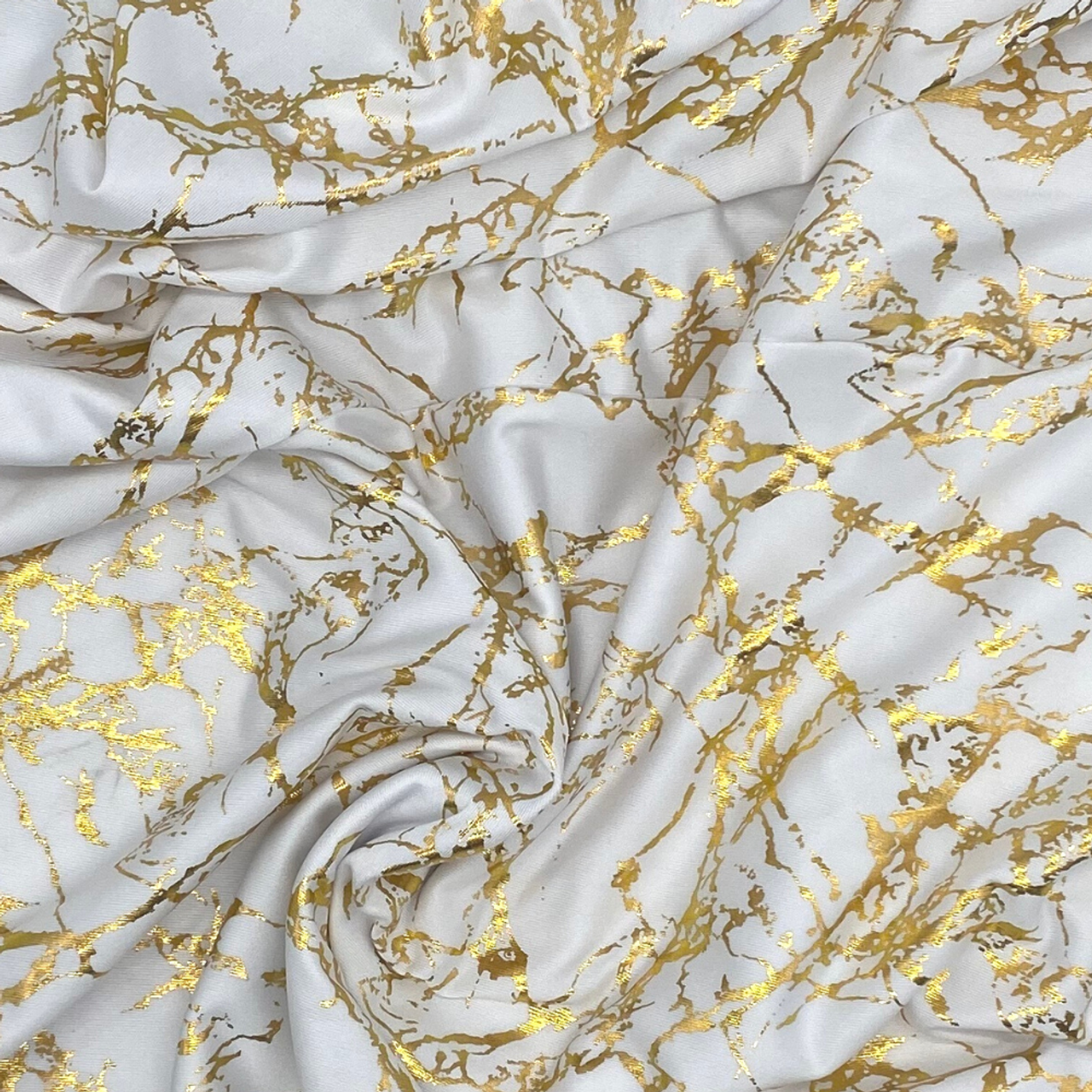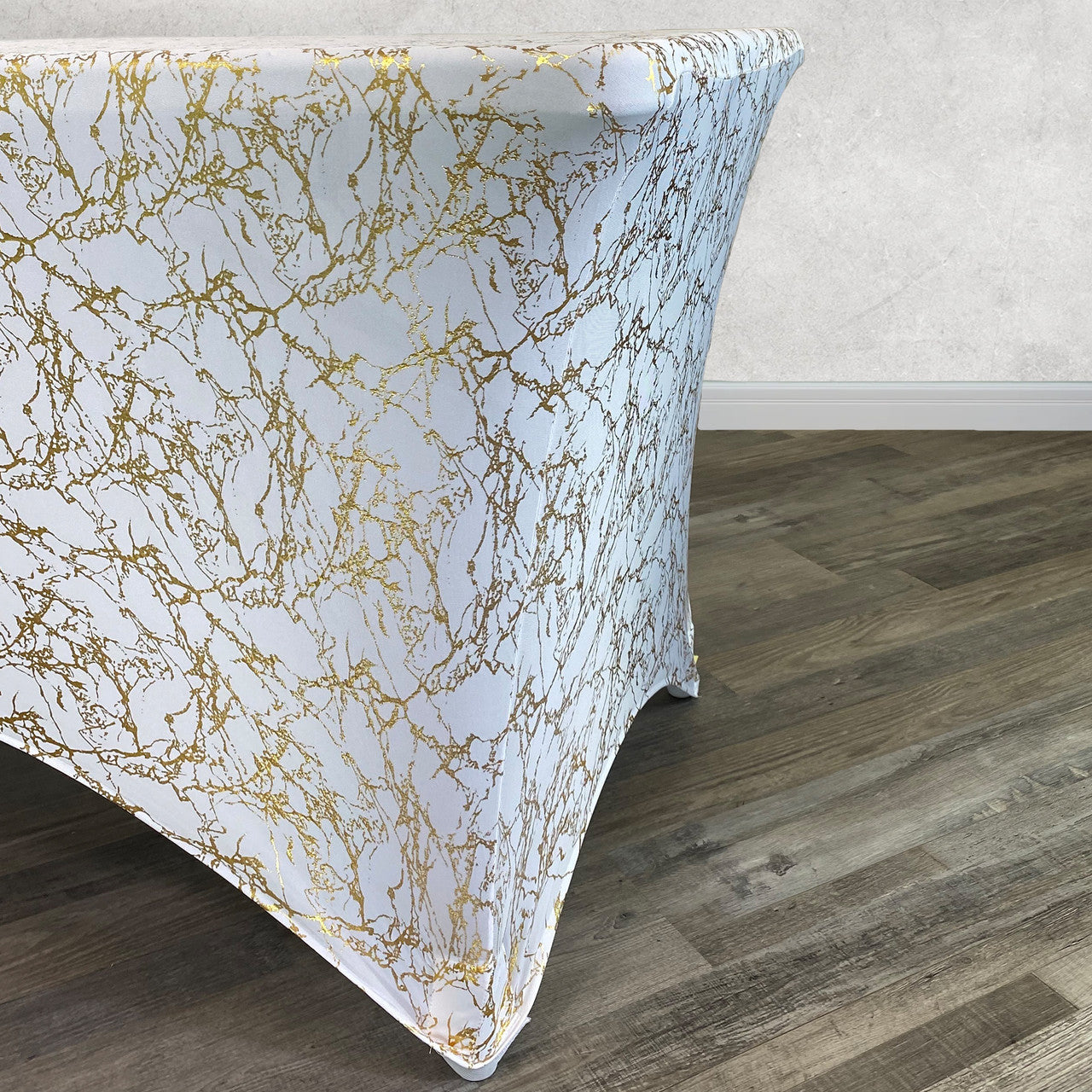 Print Spandex (6'x30") Banquet Table Cover in White With Gold Marbling