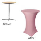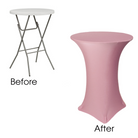 Our durable spandex chair covers fit standard 30"x42" Highboy/Cocktail Tables (30" Round x 42" Tall w/ 4 Leg Base). They're made from high quality spandex with a 4-way stretch so they're easy to put on and made to last. They're also made with durable elastic foot pockets which help secure the cover in place, ensure a great fit, and help prevent damage and excess wear and tear. These covers are a perfect way to improve the look of your chair covers and ideal for rental companies, banquet halls, hotels, various venues and special events.