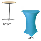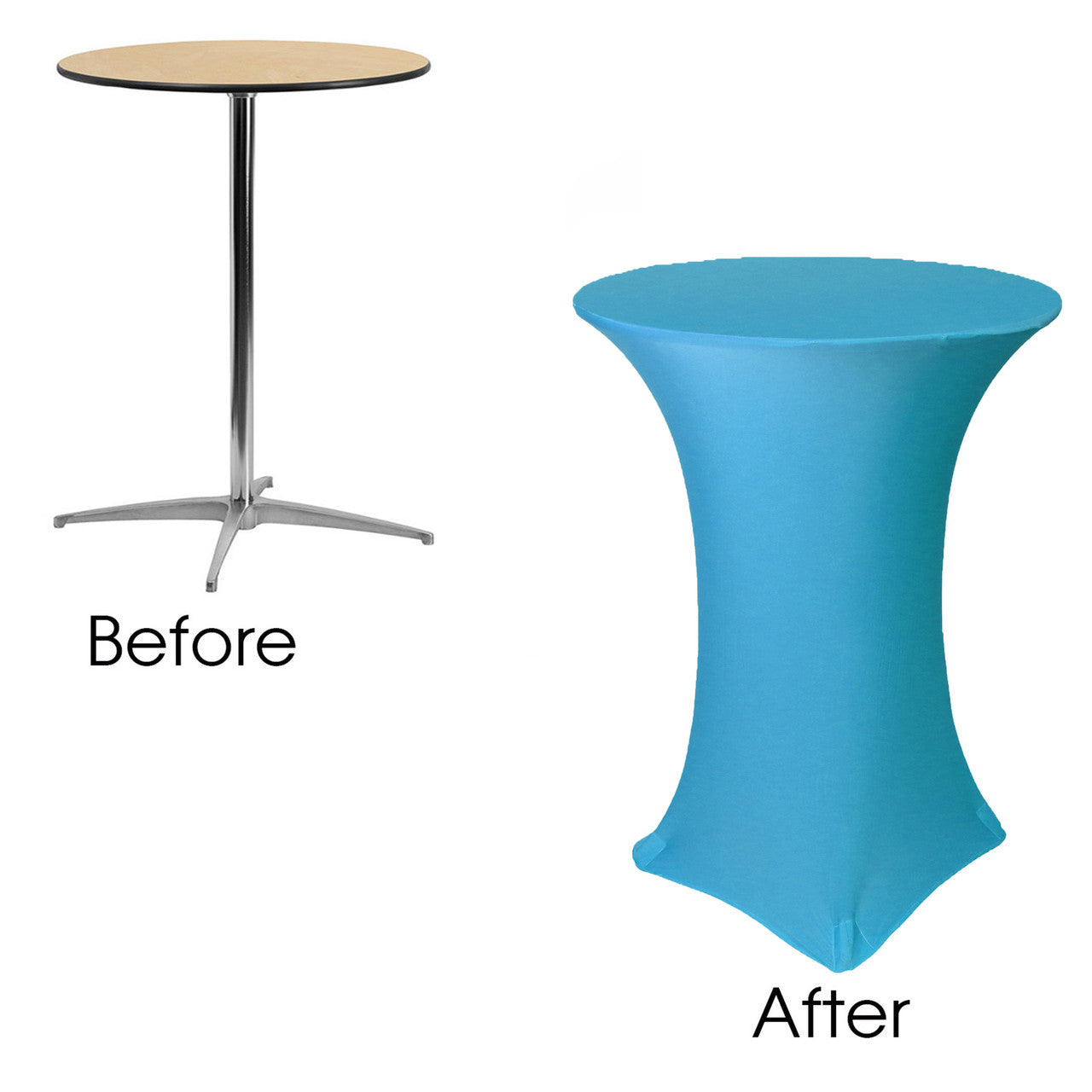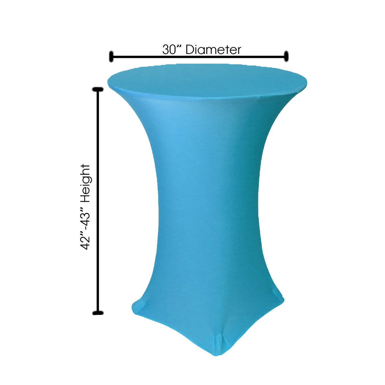 Our durable spandex chair covers fit standard 30"x42" Highboy/Cocktail Tables (30" Round x 42" Tall w/ 4 Leg Base). They're made from high quality spandex with a 4-way stretch so they're easy to put on and made to last. They're also made with durable elastic foot pockets which help secure the cover in place, ensure a great fit, and help prevent damage and excess wear and tear. These covers are a perfect way to improve the look of your chair covers and ideal for rental companies, banquet halls, hotels, various venues and special events.