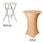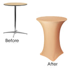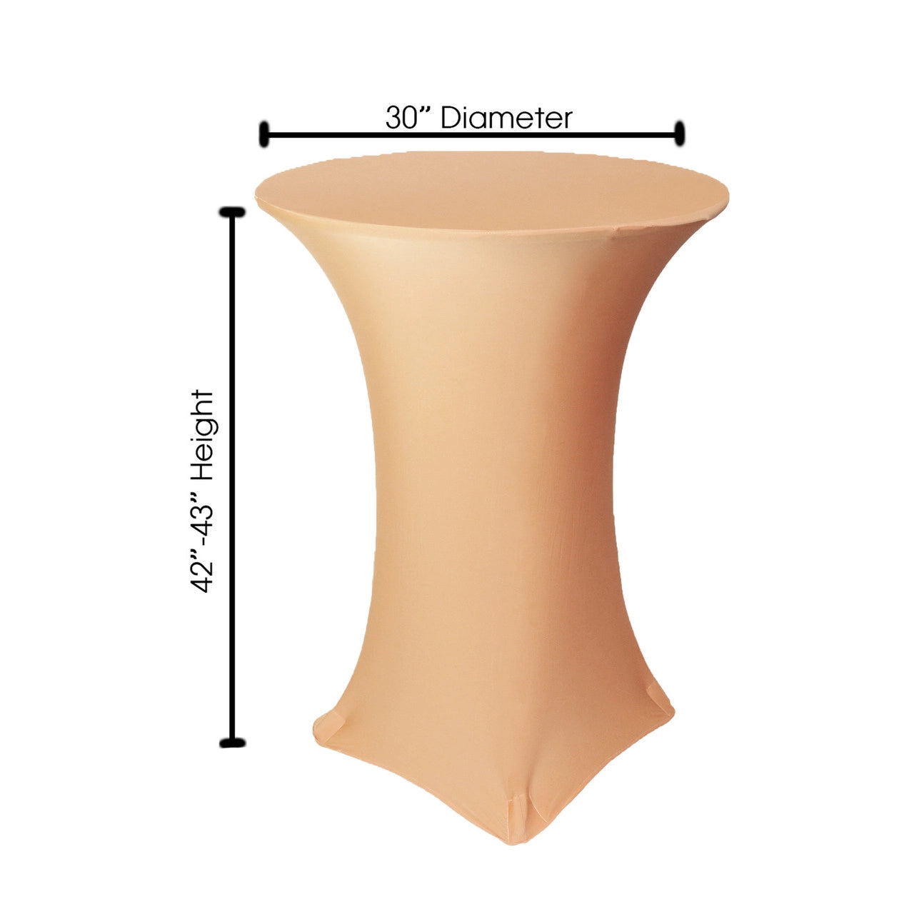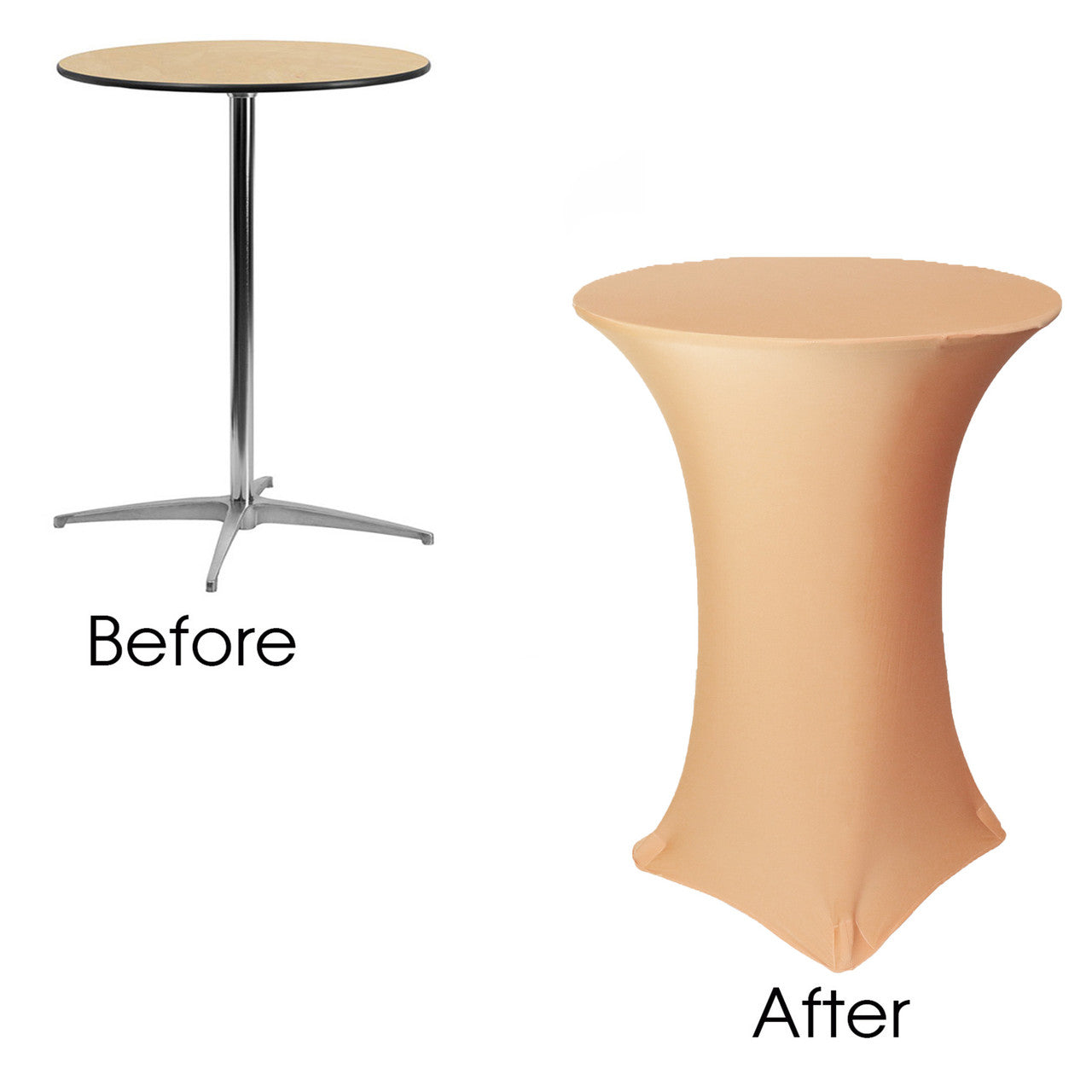 Our durable spandex chair covers fit standard 30"x42" Highboy/Cocktail Tables (30" Round x 42" Tall w/ 4 Leg Base). They're made from high quality spandex with a 4-way stretch so they're easy to put on and made to last. They're also made with durable elastic foot pockets which help secure the cover in place, ensure a great fit, and help prevent damage and excess wear and tear. These covers are a perfect way to improve the look of your chair covers and ideal for rental companies, banquet halls, hotels, various venues and special events.