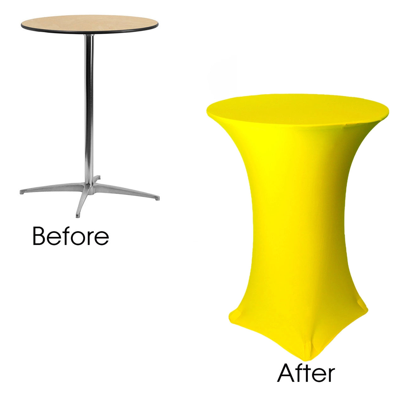 Our durable spandex chair covers fit standard 30"x42" Highboy/Cocktail Tables (30" Round x 42" Tall w/ 4 Leg Base). They're made from high quality spandex with a 4-way stretch so they're easy to put on and made to last. They're also made with durable elastic foot pockets which help secure the cover in place, ensure a great fit, and help prevent damage and excess wear and tear. These covers are a perfect way to improve the look of your chair covers and ideal for rental companies, banquet halls, hotels, various venues and special events.