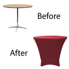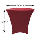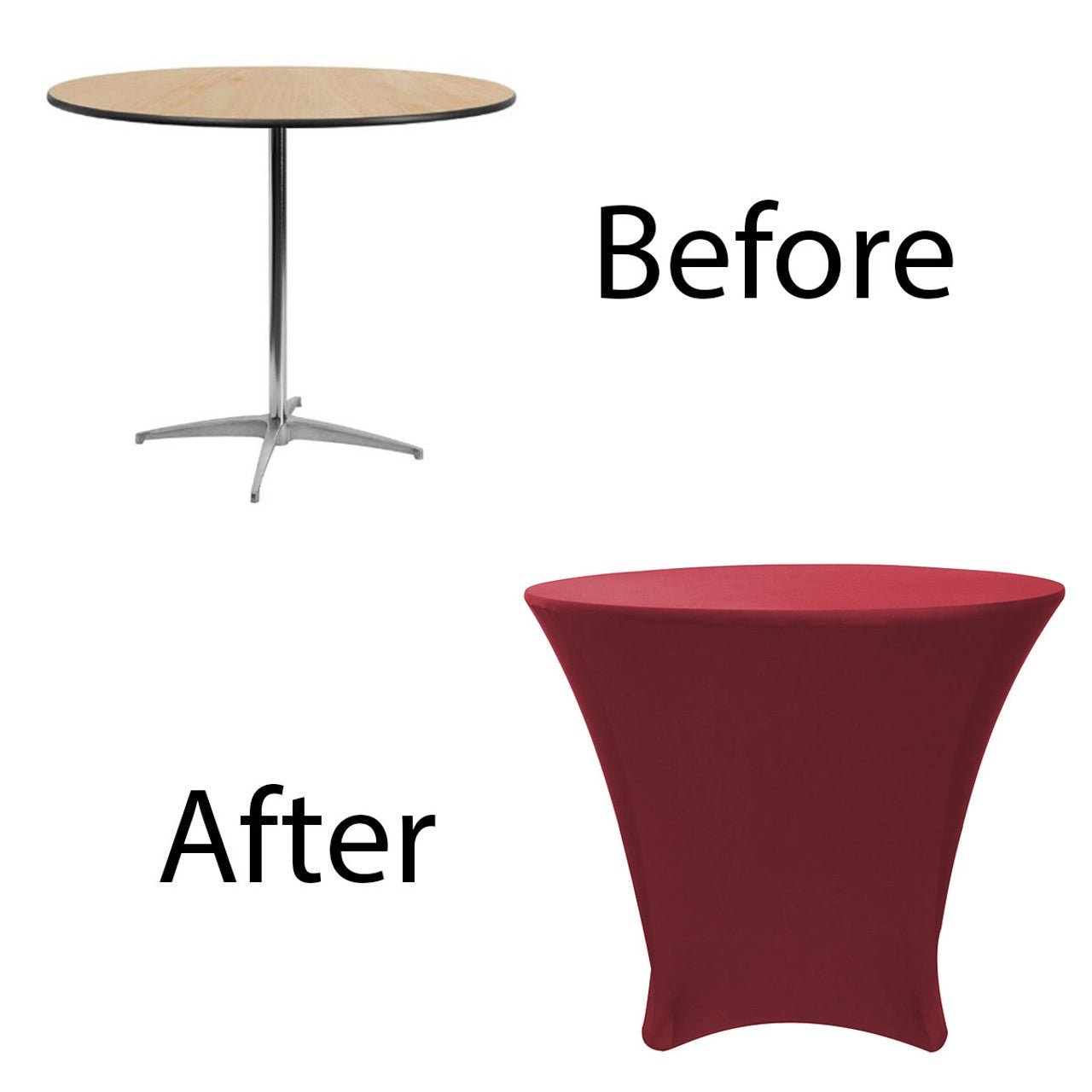 Our durable spandex chair covers fit standard 36"x30" Lowboy Tables (36" Round x 30" Tall w/ 4 Leg Base). They're made from high quality spandex with a 4-way stretch so they're easy to put on and made to last. They're also made with durable elastic foot pockets which help secure the cover in place, ensure a great fit, and help prevent damage and excess wear and tear. These covers are a perfect way to improve the look of your chair covers and ideal for rental companies, banquet halls, hotels, various venues and special events.