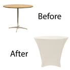 Our durable spandex chair covers fit standard 36"x30" Lowboy Tables (36" Round x 30" Tall w/ 4 Leg Base). They're made from high quality spandex with a 4-way stretch so they're easy to put on and made to last. They're also made with durable elastic foot pockets which help secure the cover in place, ensure a great fit, and help prevent damage and excess wear and tear. These covers are a perfect way to improve the look of your chair covers and ideal for rental companies, banquet halls, hotels, various venues and special events.